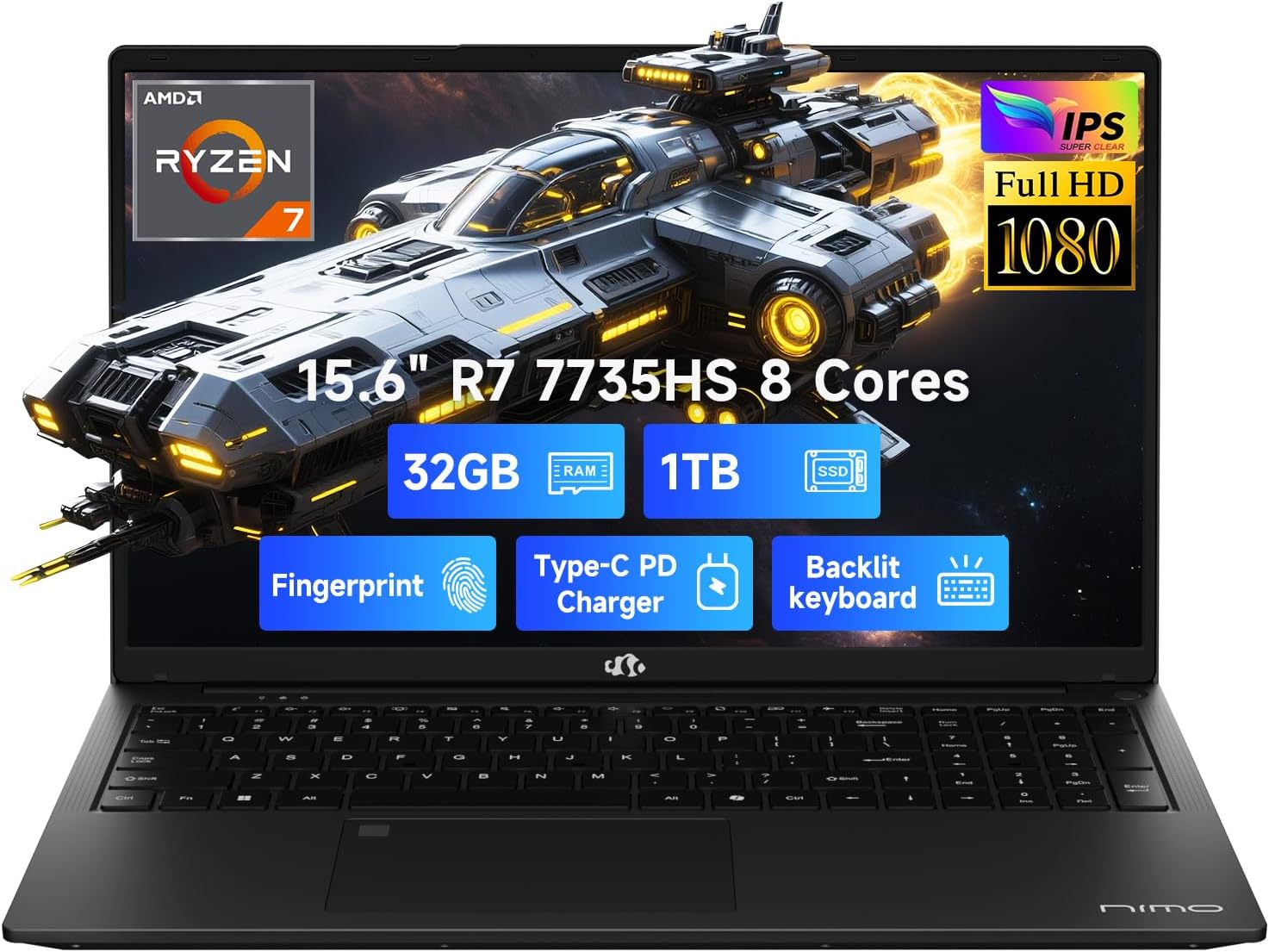 NIMO 15.6" IPS FHD Gaming-Laptop, AMD 8 Cores Ryzen 7 7735HS 32GB DDR5 RAM 1TB SSD (Beats i7-12650H, Up to 4.75GHz) Computer with Radeon 680M 100W Type-C Backlit Keyboard Fingerprint Unlock, Black
