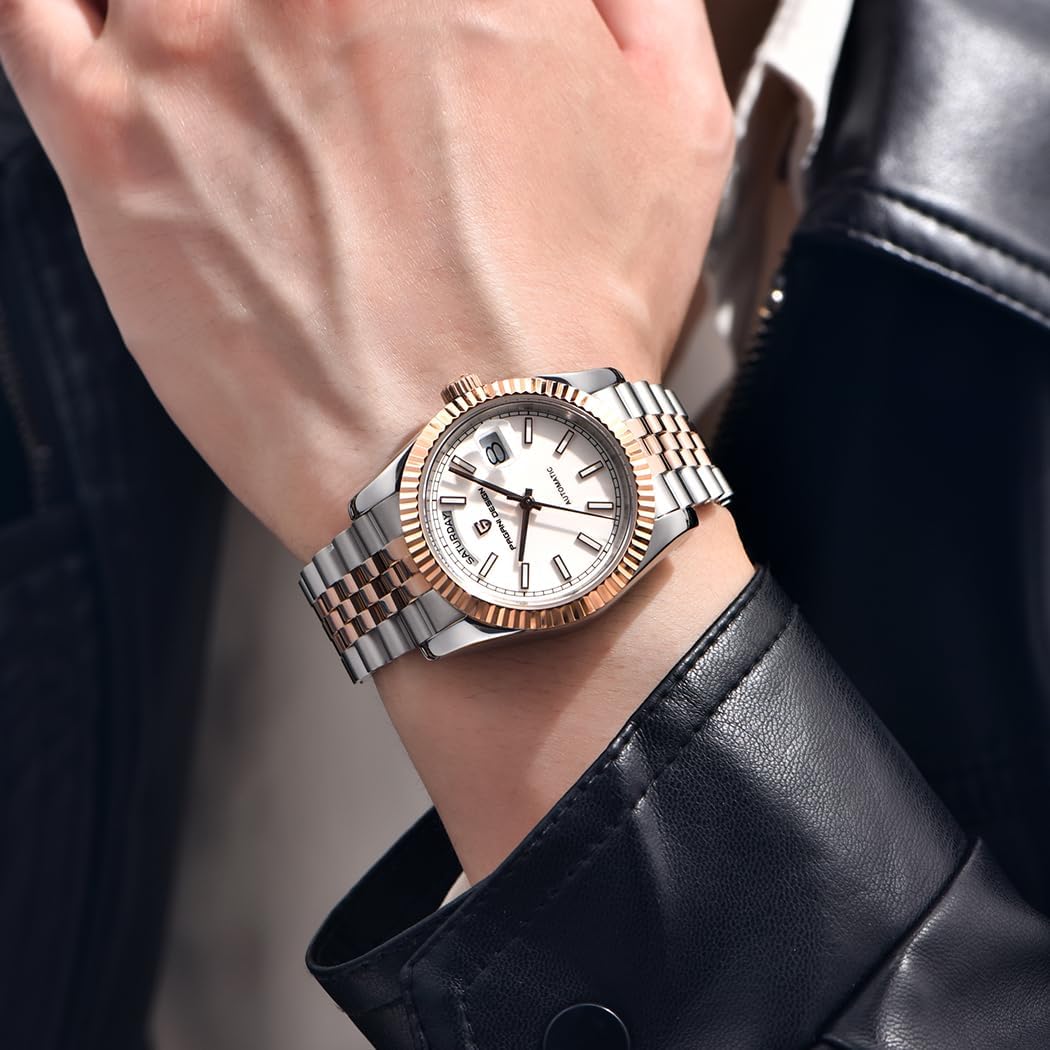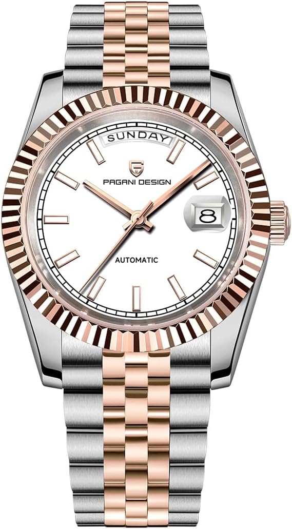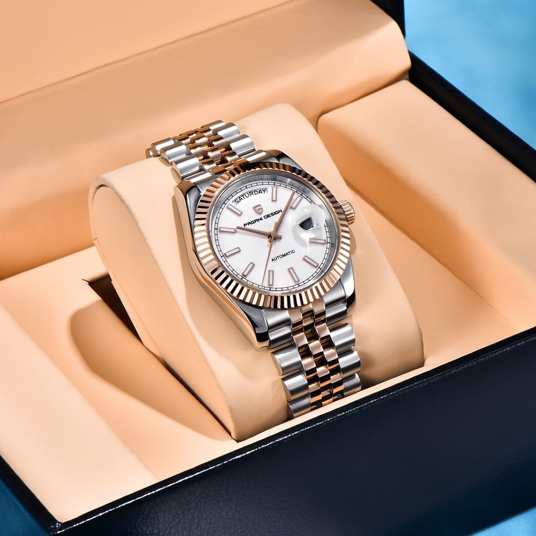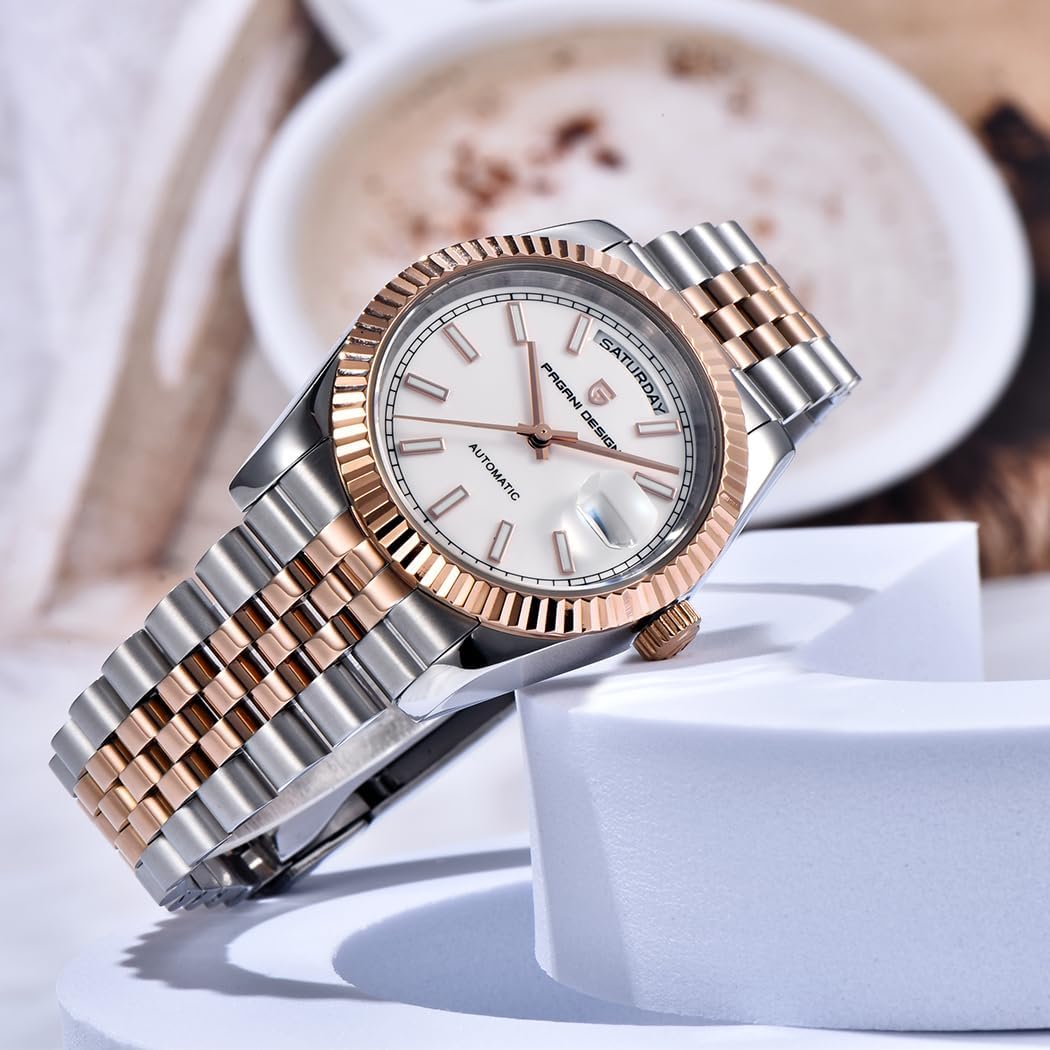 Pagani Design Men's Watch DD36, a Luxury Men's Watch Featuring a Gold dial, Dual Date Display, Sapphire Crystal Glass, Stainless Steel case, 10 bar Water Resistance, and ST16 Movement.