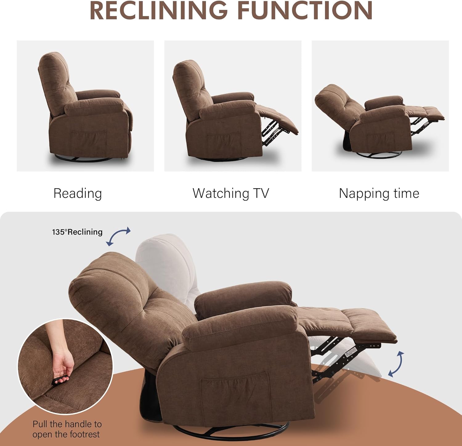【ROCKING AND TURNING RECLINER】 Just pull the recliner chair handle on the side, and you can lie down (maximum 135 degrees), while the 30-degree rocking function, can let you relax at leisure, 360-degree rotation can easily convert the direction, easy to sit or lie down to move the direction. Whether you are watching TV, reading, playing with your phone, resting, or massaging, the Swivel rocking recliner is very practical and allows you to enjoy life to the fullest.