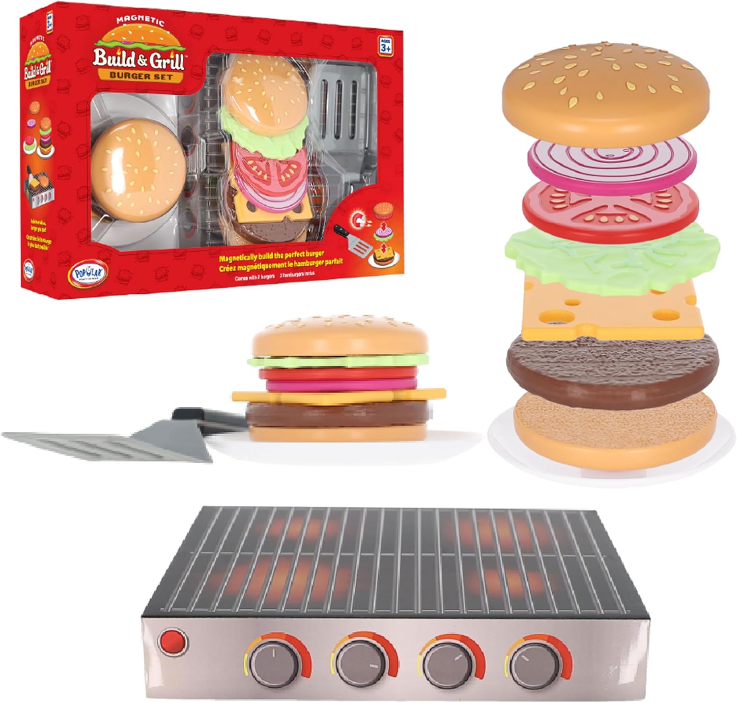 Popular Playthings Magnetic Build & Grill Hamburger Set, 16pc Educational Toddler Play Food Toy for Ages 3+