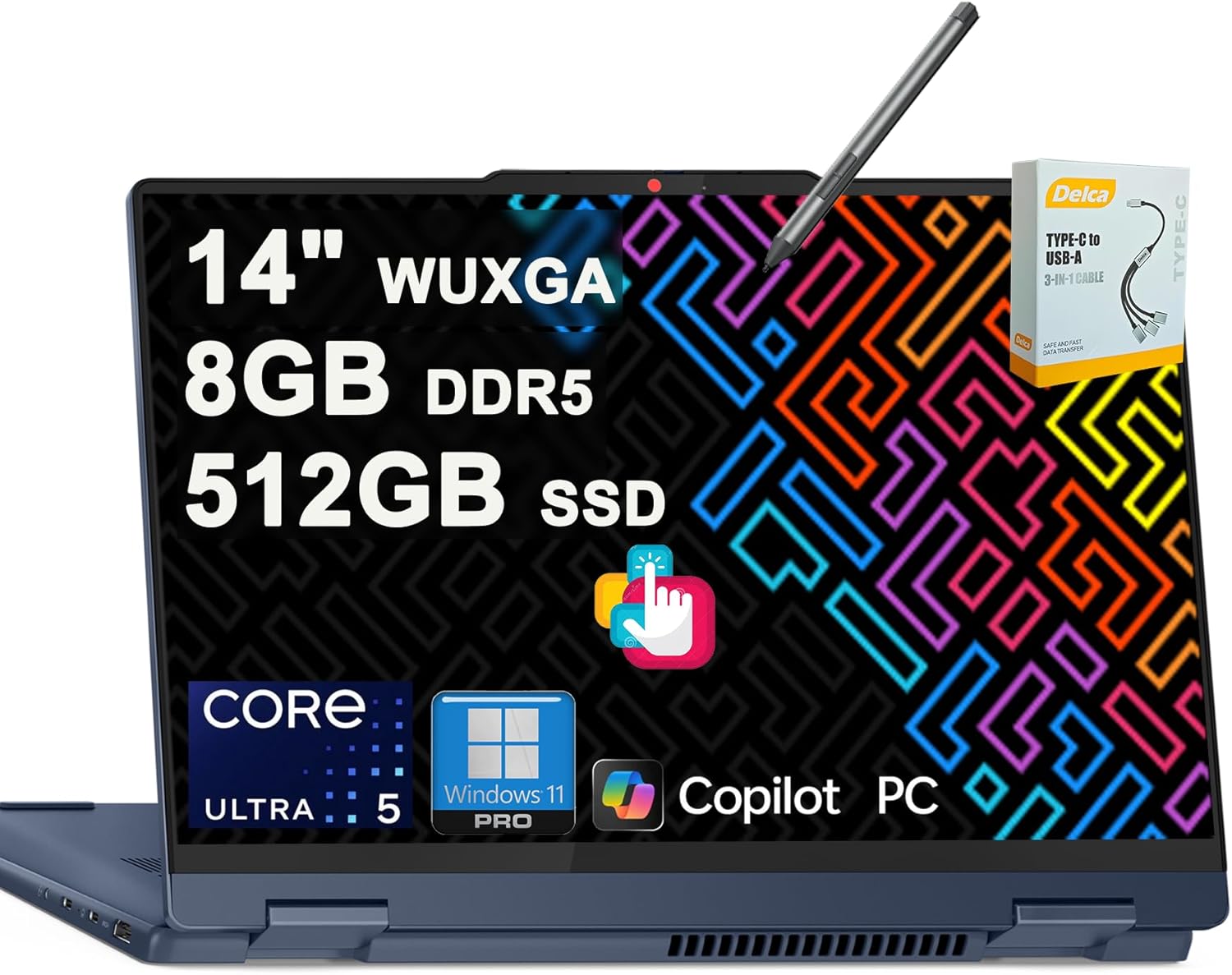 Lenovo IdeaPad Flex 5i 2-in-1 Copilot AI PC Laptop | 14" WUXGA Touch | Intel 12-core Ultra 5 225U (>Core 7 150U) | 8GB DDR5 512GB SSD | Backlit FHD IR Privacy Camera Wi-Fi6 Win11Pro w/DLCA Accessory