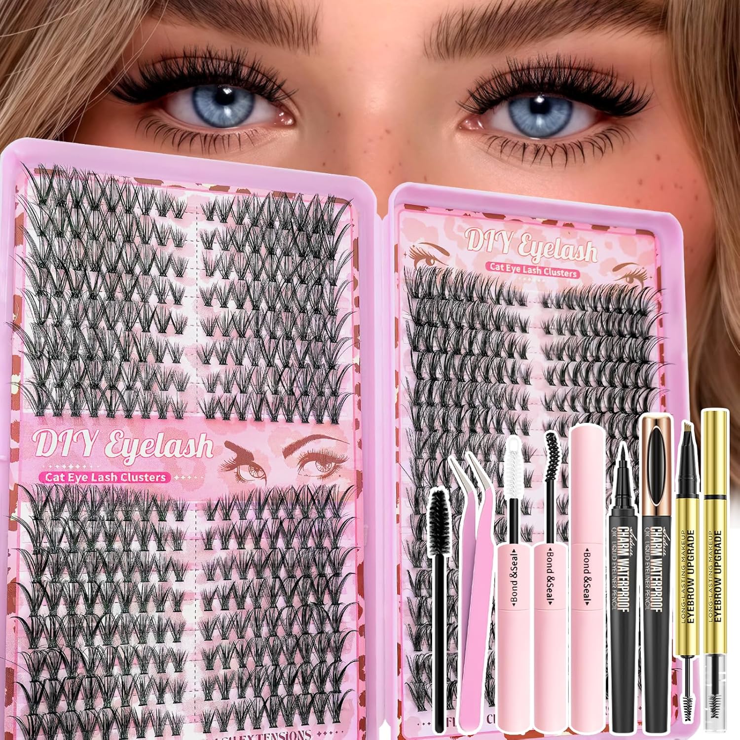 【Lash Clusters Kit】560-piece 9-16mm single natural eyelash extension kit, D-shaped, curled, fluffy, and slender false eyelashes. The 40D-60D-80D kit includes eyelash adhesive and sealant, tweezers, a brush, a black eyeliner, and a dual-ended 2-in-1 four-pronged brow pencil with a brow glue brush. It's ideal for first-time users and quick everyday styling.