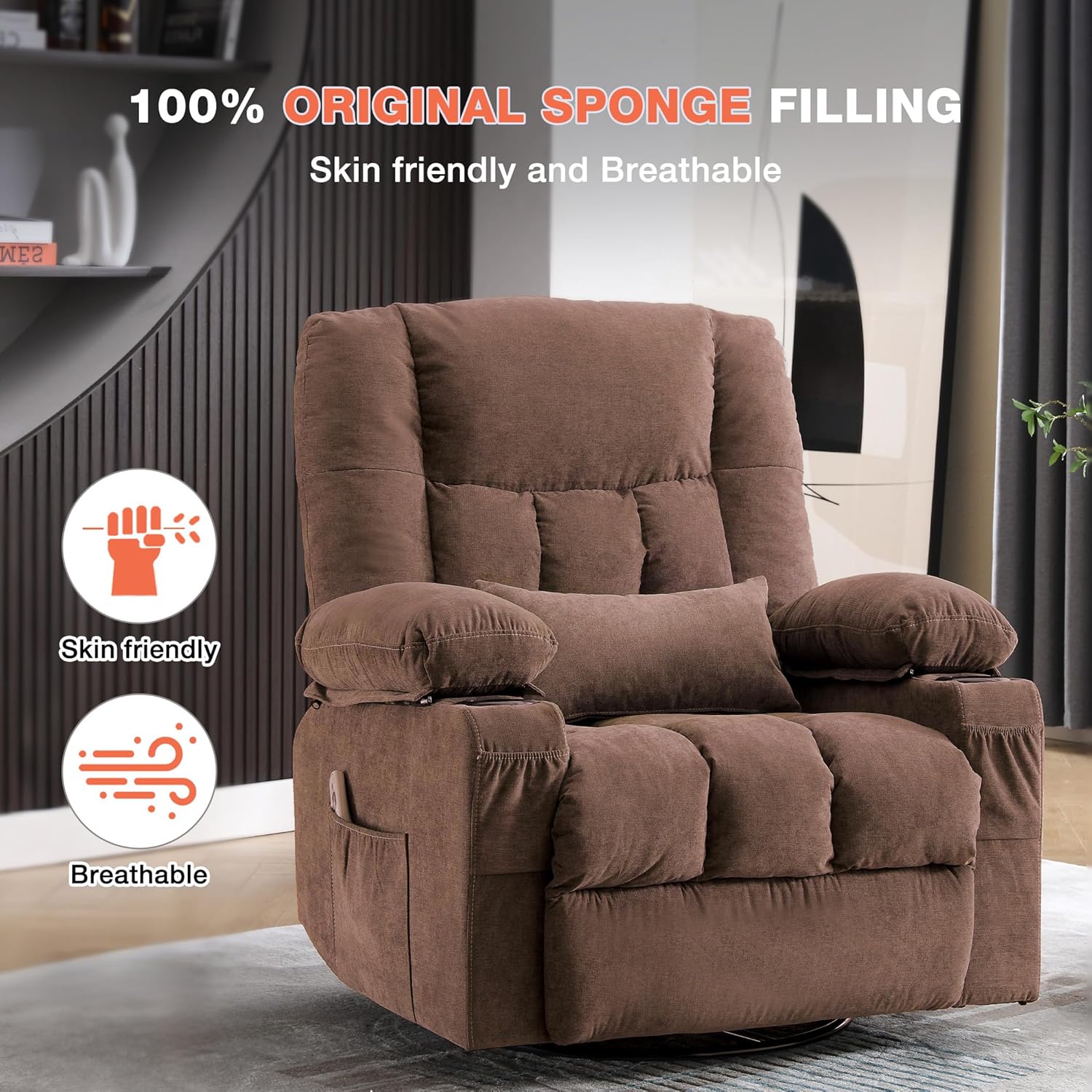 𝐄rgonomic 𝐃esign & 𝐏remium 𝐌aterials:Step into a sanctuary of calm with our ergonomic recliner,crafted to turn every moment into a serene escape.Wrapped in breathable,skin‑friendly fabric and packed with 100% high‑resilience foam, it molds to your spine and adapts to your curves.Whether you’re gently rocking or fully reclining,you’ll enjoy lasting support,plush comfort and style,making home the ultimate retreat