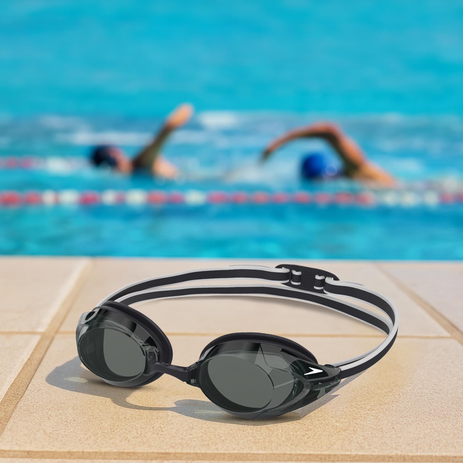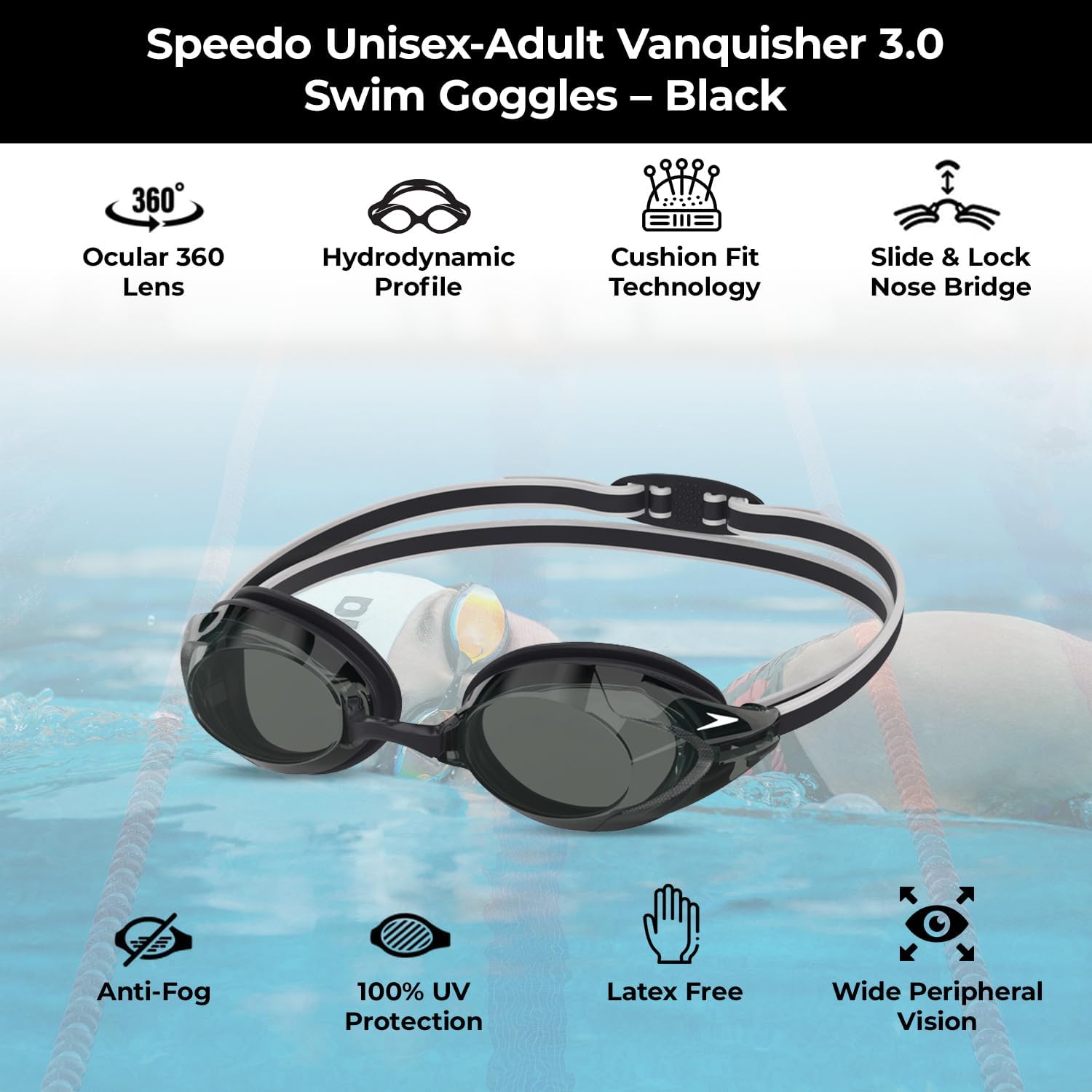 Since 1928, Speedo has been the world’s leading swimwear brand, born on Australia’s Bondi Beach with the mission to inspire everyone to swim. From creating the Racerback suit that changed swimwear forever to chlorine-resistant fabrics and advanced racing technology, Speedo has always led the way in innovation. Today, Speedo continues to combine passion with performance, supporting Olympic champions, athletes, and everyday swimmers. With cutting-edge designs, a strong focus on comfort, and a proud legacy of winning more Olympic gold medals than any other brand, Speedo remains the trusted name in swimming worldwide. Speedo Unisex-Adult Vanquisher 3.0 Swim Goggles Take your swim to the next level with the Speedo Vanquisher 3.0 Goggles. Built with a hydrodynamic low-profile frame, cushioned silicone gaskets, and 14% wider optics, these goggles deliver speed, clarity, and comfort in every swim. The slide-and-lock nose bridge ensures a perfect fit, while anti-fog lenses and 100% UV protection keep your vision sharp. With a latex-free design, these goggles are built for swimmers who demand both performance and style. # Key Benefits: - Wider Field of View with Enhanced Optics - Low-Profile Frame for Reduced Drag - Soft Silicone Gaskets for Comfort & Seal - 4 Interchangeable Nose Bridges for Custom Fit - Anti-Fog Lenses & 100% UV Protection - Latex-Free Construction for Safety & Durability