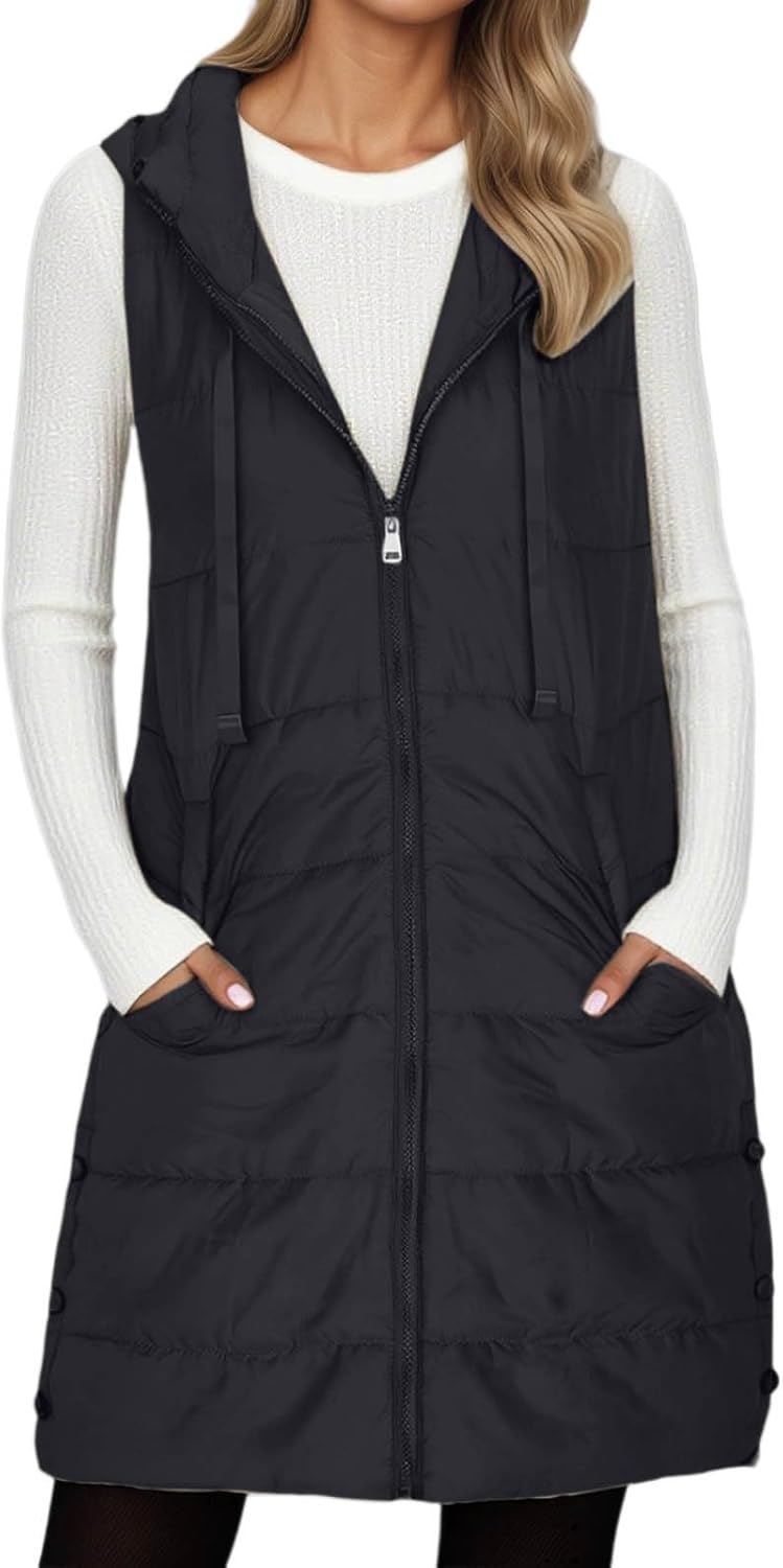Long Puffer Vest Women Sleeveless Quilted Hooded Fall Winter Button Down Zip Up Puffer Vests Jacket Outwear