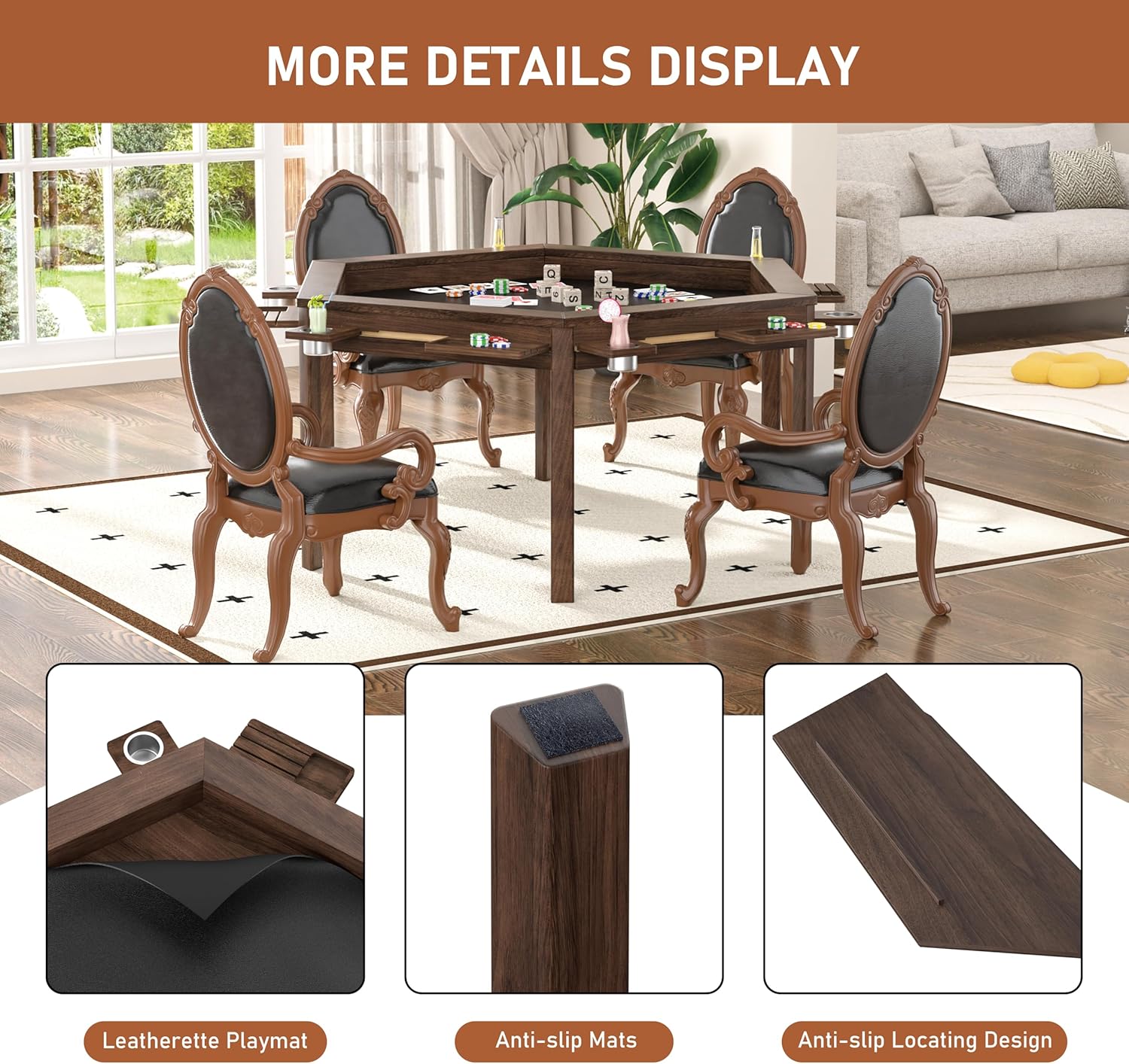 Practical Accessories: The detachable sliding cup holders keep drinks neatly arranged and within easy reach; the sliding trays are convenient for disassembly and cleaning, storing small accessories and cards to keep the tabletop tidy. Paired with a durable leatherette game mat, it adds comfortable touch and protects game pieces and collectibles