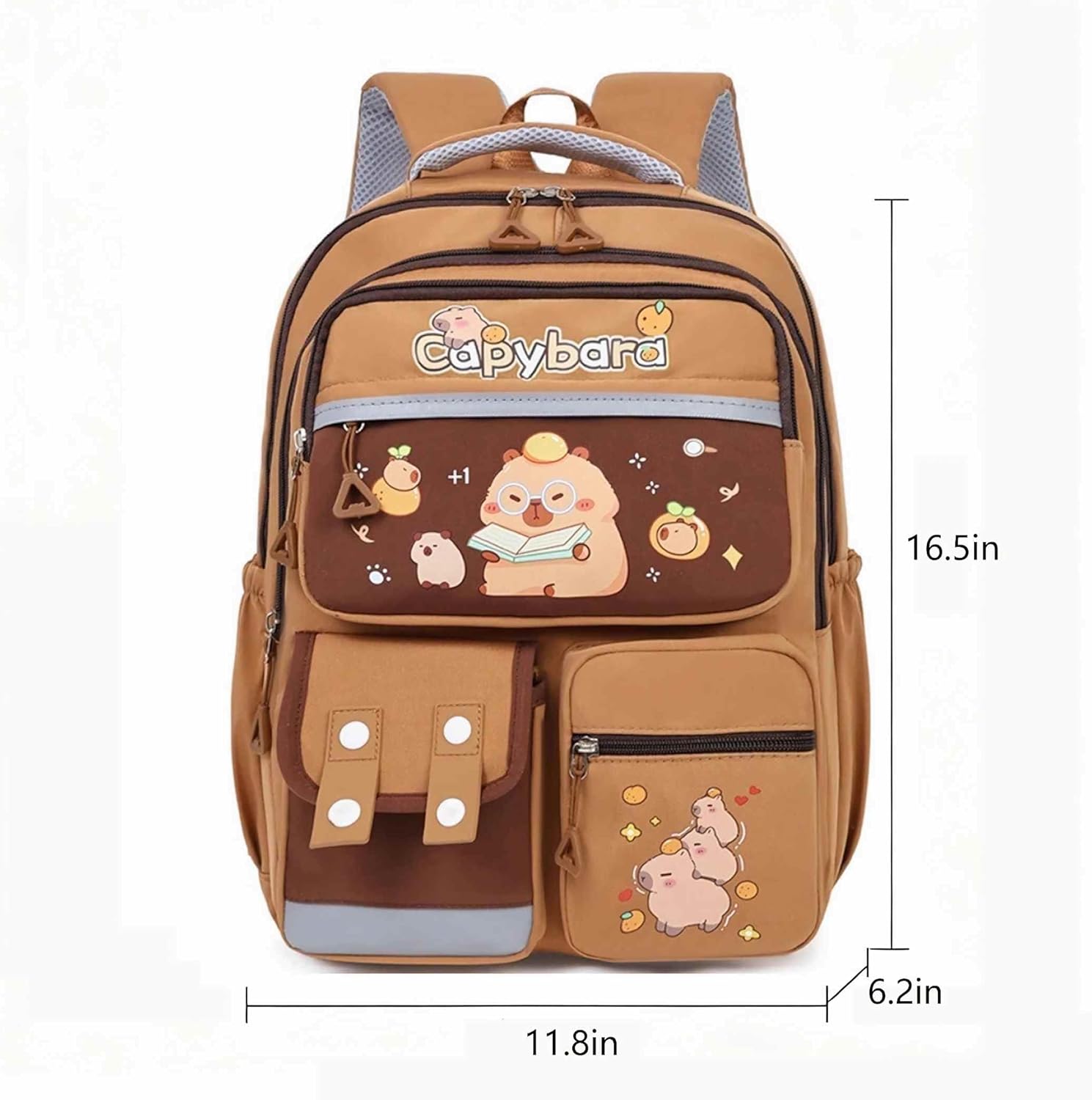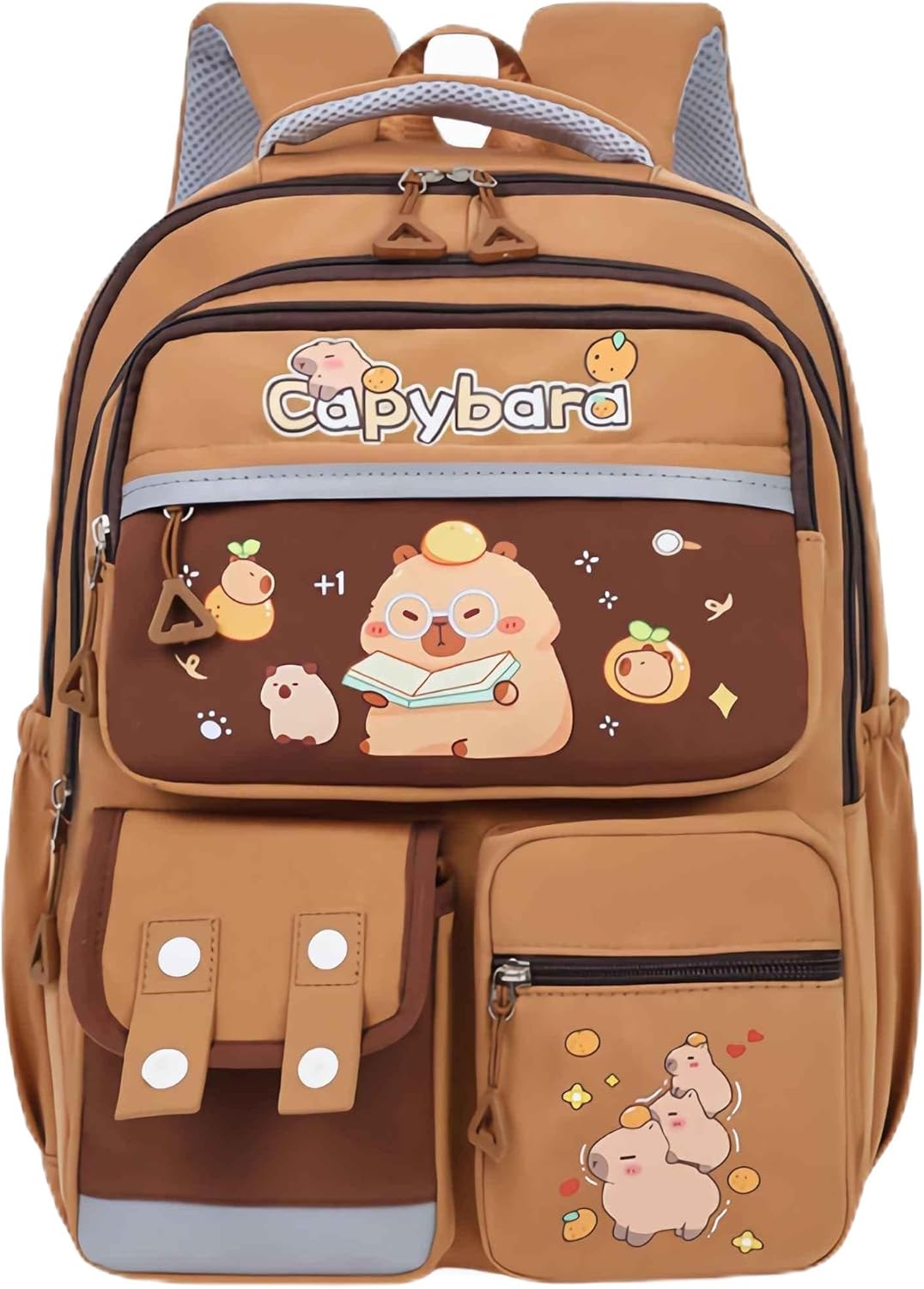 Introducing this adorable Capybara backpack that combines style with functionality. The charming brown design features delightful cartoon capybara characters engaged in various activities, including a scholarly capybara reading a book. Multiple compartments make organization a breeze, with a spacious main section, front pocket, and additional storage areas. The backpack showcases a perfect blend of whimsical design and practical features, including comfortable padded shoulder straps and mesh backing for added comfort. The contrasting brown and light gray color scheme creates an appealing aesthetic, while the durable construction ensures it can handle daily use. The front pocket features decorative button details, adding a unique touch to the design. This backpack is ideal for students, casual outings, or anyone who appreciates cute animal-themed accessories. The Capybara branding is prominently displayed, making it a distinctive choice for those who want to stand out with their school or everyday carry gear.