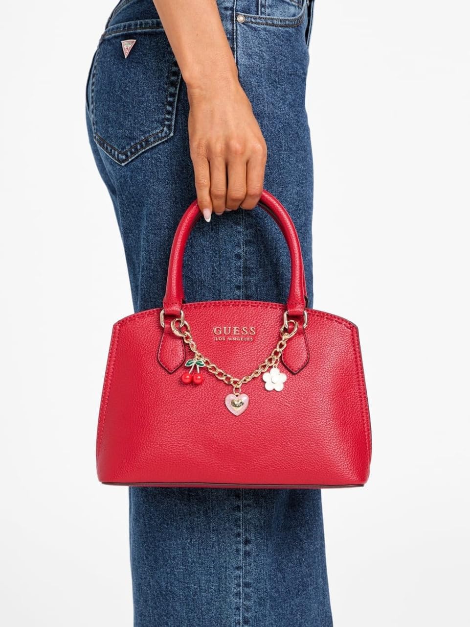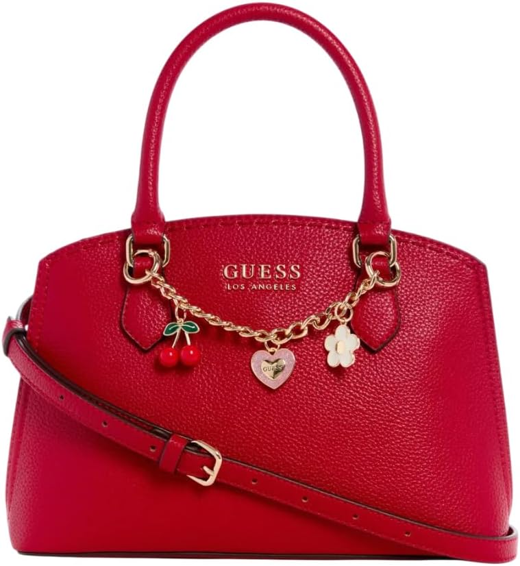 GUESS Factory Women's Lynne Charm Small Satchel Pebbled faux-leather small satchel Shiny pale gold-tone hardware with front logo Organized three-compartment interior with lining Zip closure Top handles with chain-link charm detail and 4.25" drop. Detachable crossbody strap. 10.75"W x 7.75"H x 4"D