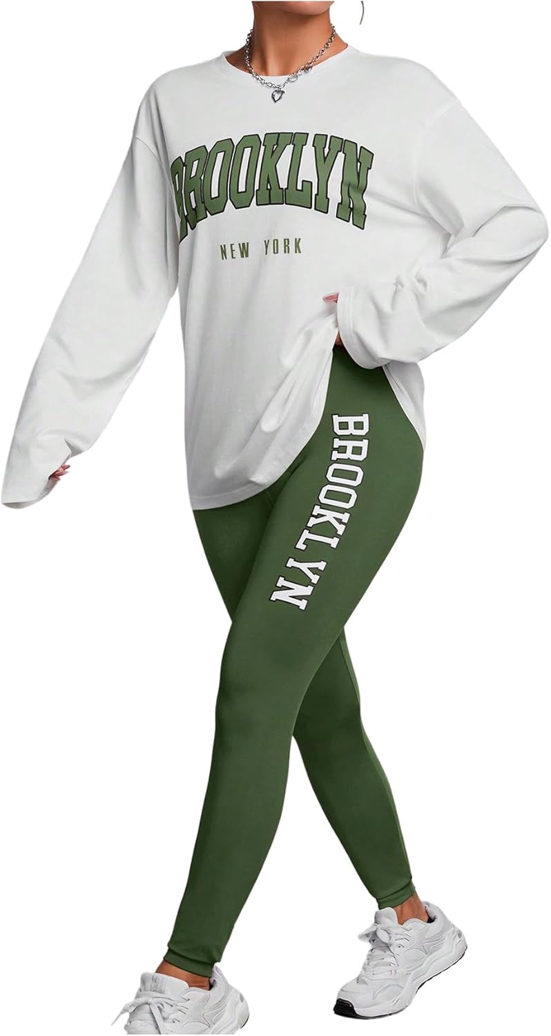 SweatyRocks Women's 2 Piece Outfits Letter Print Crew Neck Long Sleeve Tee Top and Leggings Clothing Sets Fall