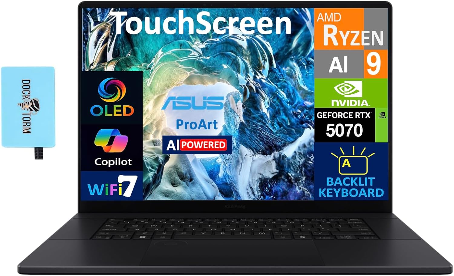 ASUS ProArt P16 AI Creator Laptop 16.0" Touchscreen OLED 4K Display (AMD Ryzen AI 9 HX 370, 32GB LPDDR5X, 2TB PCIe SSD, GeForce RTX 5070, Copilot+, Backlit KB, Win 11 Pro) w/DKZ USB Port Expander