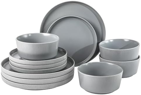 Gibson Home Dempsey Road 12-Piece Stoneware Dinnerware Set – Service for 4, Round Grey Plates and Bowls, Durable Solid Color Modern Embossed Dish Set, Microwave & Dishwasher Safe