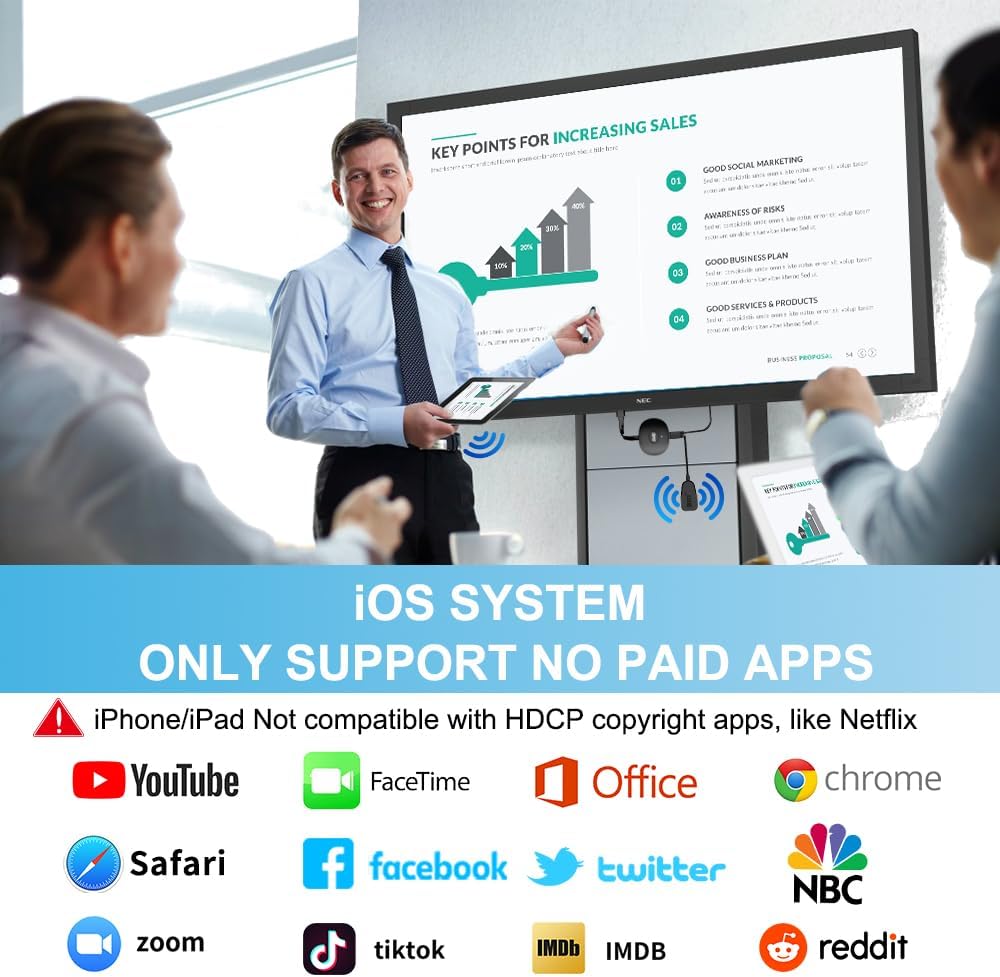 【HDCP LIMITATION FOR IOS MIRRORING】Our Wireless HDMI Dongle supports casting your iPhone, iPad, or MacBook to a larger screen for web browsing, watching movies, presentations, and more. It works with YouTube, Instagram, TikTok, and other non-HDCP copyright-protected apps. (Note: Due to Apple’s HDCP restrictions, premium apps like Netflix and Prime Video are not supported.)