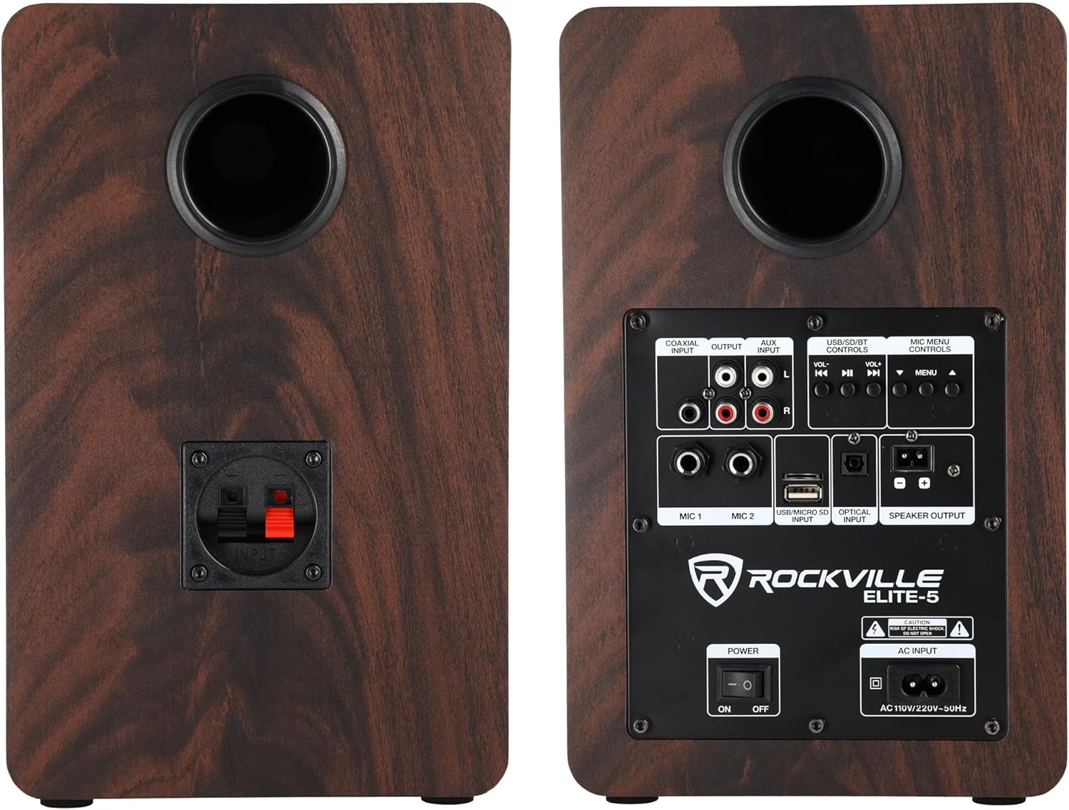 Rockville ELITE-5D Bluetooth Bookshelf Speakers – 800W, 5.25" Drivers, Optical & USB Inputs, Dual Mic Inputs, Dark Wood Finish
