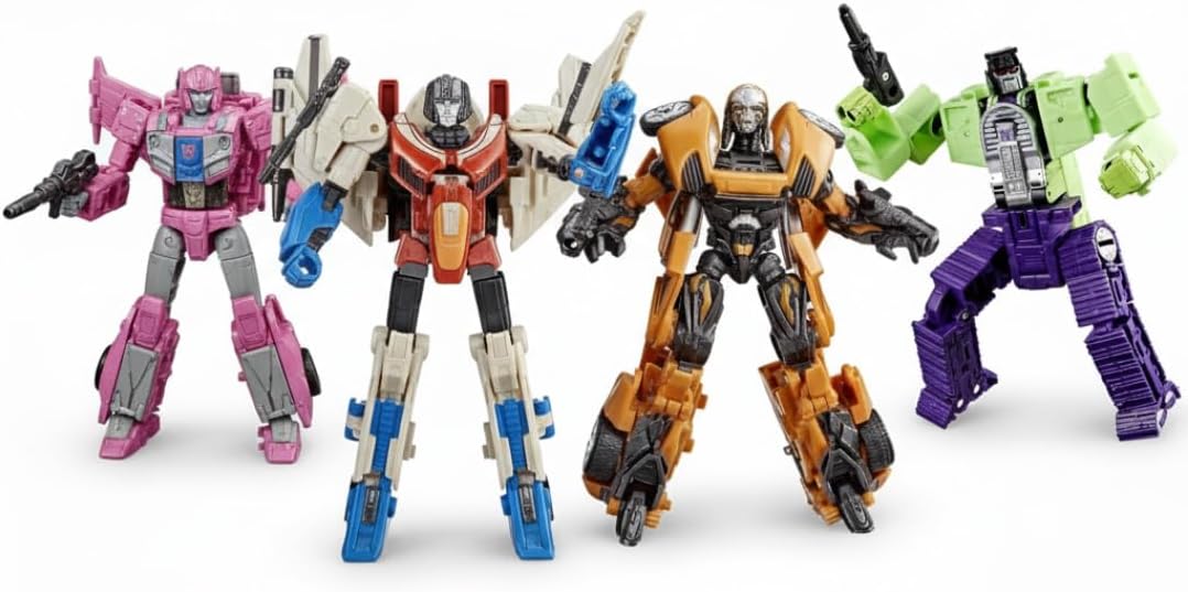 Bundle Includes: Hasbro - Transformers Studio Series Deluxe Class Transformers One Elita-1 Action Figure, Hasbro - Transformers: Age of Extinction Deluxe Class Concept Art KSI Widow Action Figure, Hasbro - Transformers Deluxe Class: The Movie Construction Scavenger Action Figure, Hasbro - Transformers Studio Series Deluxe Class Transformers One Starscream Action Figure.