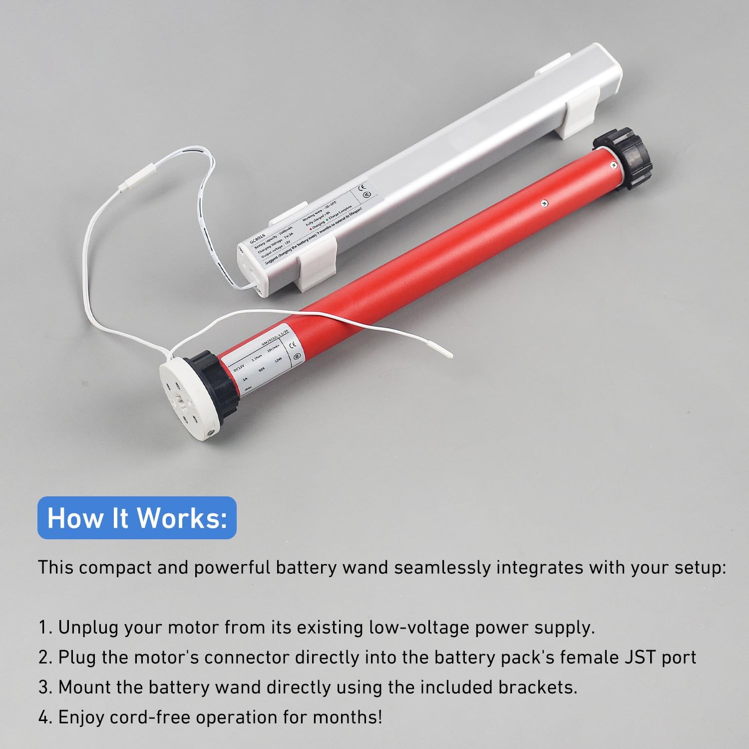 Rollerhouses 12V Rechargeable Battery Pack for Motorized Blinds - 2600mAh Reloadable Battery Wand with Female JST Connector & Wall Mount Brackets - Power DC12V Tubular Motors