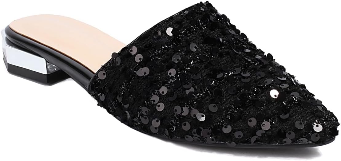 Pointed Toe Slip On Flat Mules for Womens Glitter Sequins Comfort Slide Slippers Walking Backless Loafers Shoes