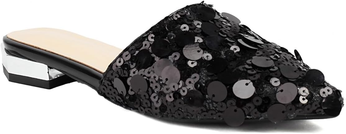 Slip On Flat Mules for Womens Glitter Sequins Pointed Toe Comfort Slide Slippers Walking Backless Loafers Shoes