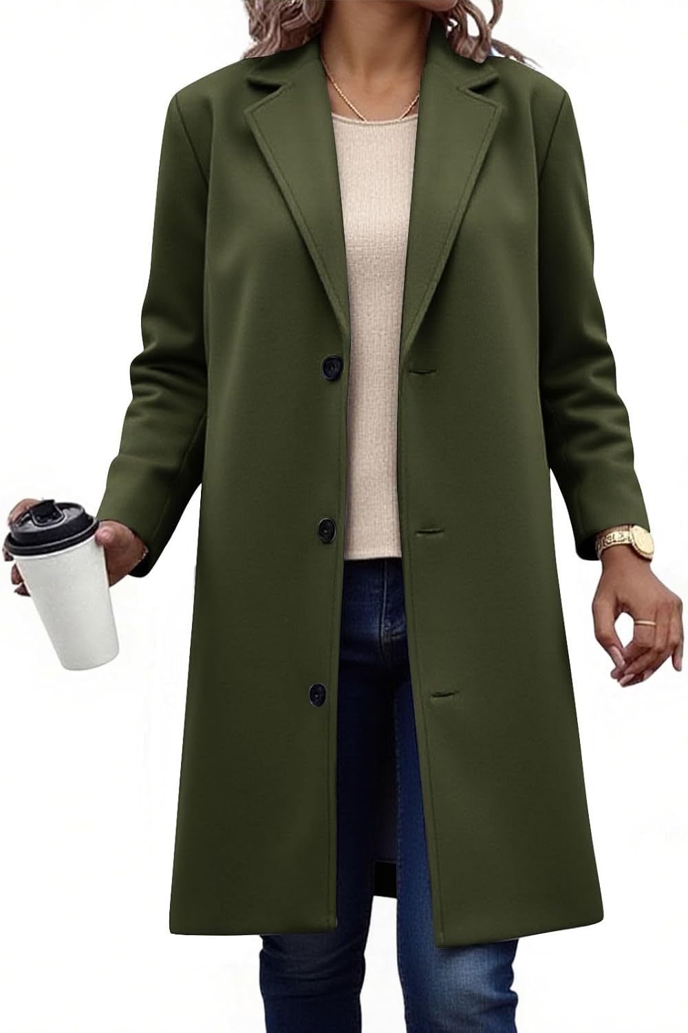 Womens Mid-Long Wool Blend Coat Notch Lapel Single Breasted Trench Pea Coat Winter Elegant Jacket Outerwear