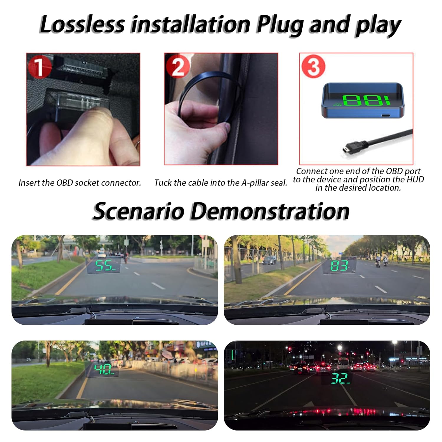 【Easy to Install】The product is easy to install, plug and play, just use the usb cable included inside the product to connect the car and the product, start the engine to power on and use. With a delicate and compact body, you can clearly see the data no matter where you place it, without affecting your line of sight. The HUD can also automatically turn on and off, start and stop with the car, and automatically turn on and off