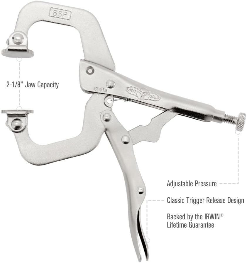 IRWIN VISE-GRIP Original Abrazadera de Bloqueo con Almohadillas Giratorias, 6", cuenta con mordazas de gran apertura para mayor versatilidad y la capacidad de sujetar una variedad de pequeños artículos con una sola herramienta. La presión y el ajuste se pueden ajustar con el tornillo que permanece ajustado para uso repetitivo. Construido con acero de aleación de alta calidad tratado térmicamente para máxima resistencia y durabilidad, estas pequeñas abrazaderas tienen el diseño clásico de liberación por gatillo que mantiene la máxima fuerza de bloqueo donde la necesita.