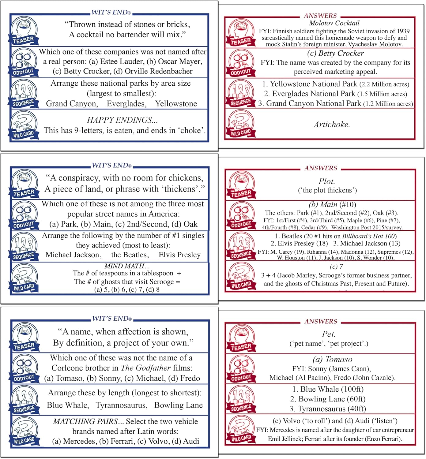 ¿Crees Que Eres Inteligente? ¡Demuéstralo! — Wit's End es un desafiante juego de mesa de trivia y rompecabezas donde los jugadores compiten en cuatro categorías de trivia inteligente que ponen a prueba la mente. Cuatro categorías diseñadas de forma única involucran tus poderes de deducción y tu conocimiento: