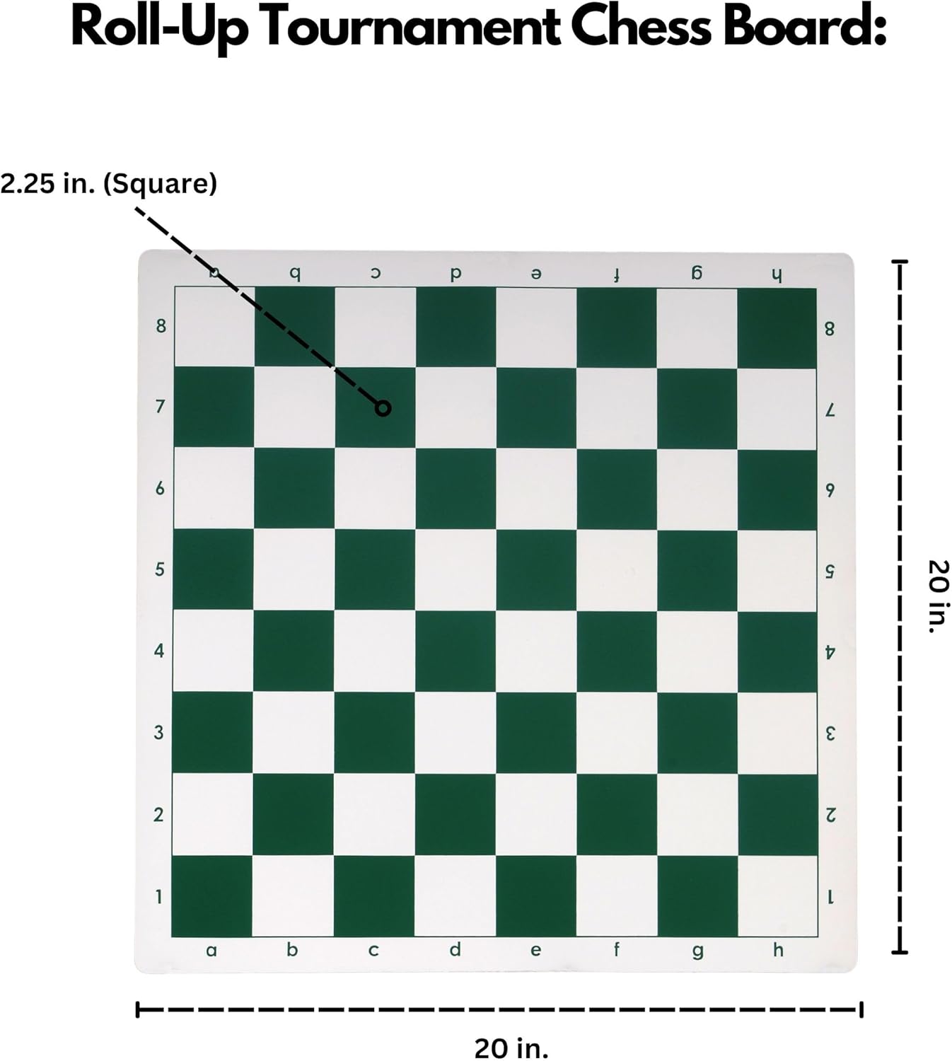 TABLERO DE VIAJE: Este tablero enrollable, flexible pero resistente, es ideal para los viajeros y se almacena fácilmente. Incluye notación algebraica en el perímetro de los cuadrados para simplificar las lecciones y estudiar juegos anteriores. Tablero de tamaño completo mide 20 pulgadas con cuadrados de 2.25 pulgadas.