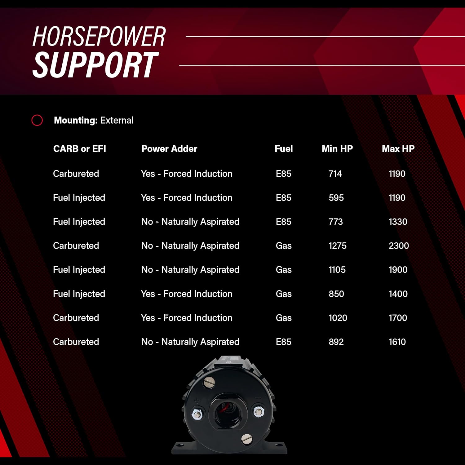 POWERFUL CAPACITY: This high HP fuel pump supports Fuel Injected Engines: up to 1900 HP - naturally aspirated and up to 1400 HP - forced air induction; Carbureted Engines: up to 2300 HP - naturally aspirated and up to 1700 HP - forced air induction