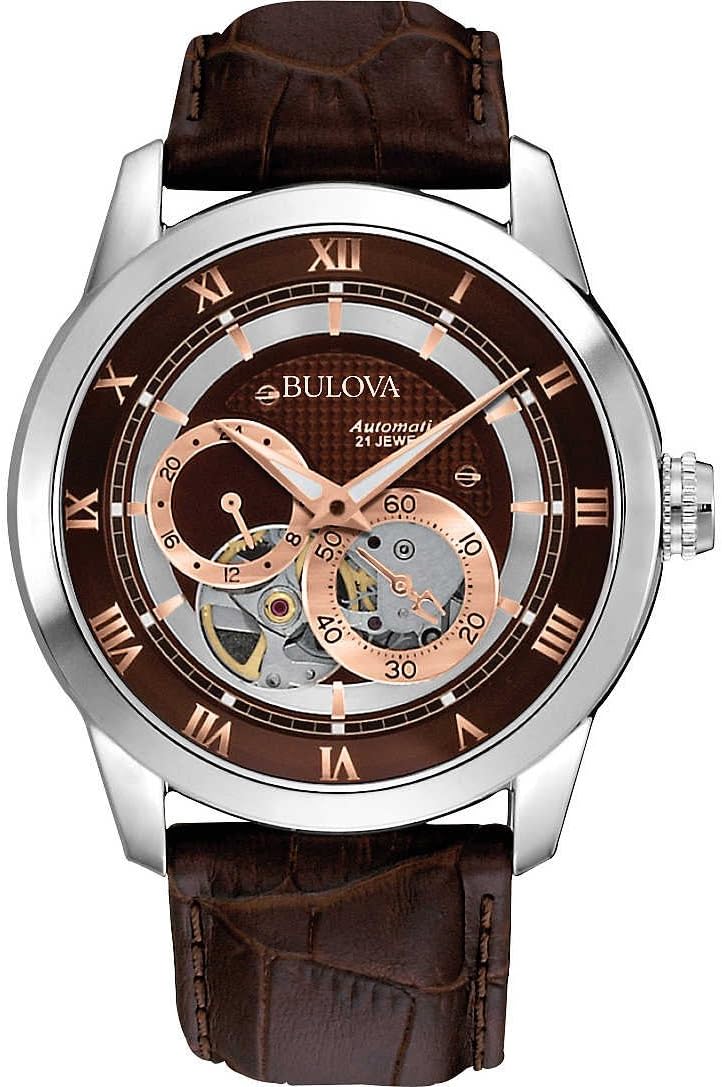 Reloj automático de diseño para hombre Bulova con correa de cuero - Dial marrón/oro rosa 96A120