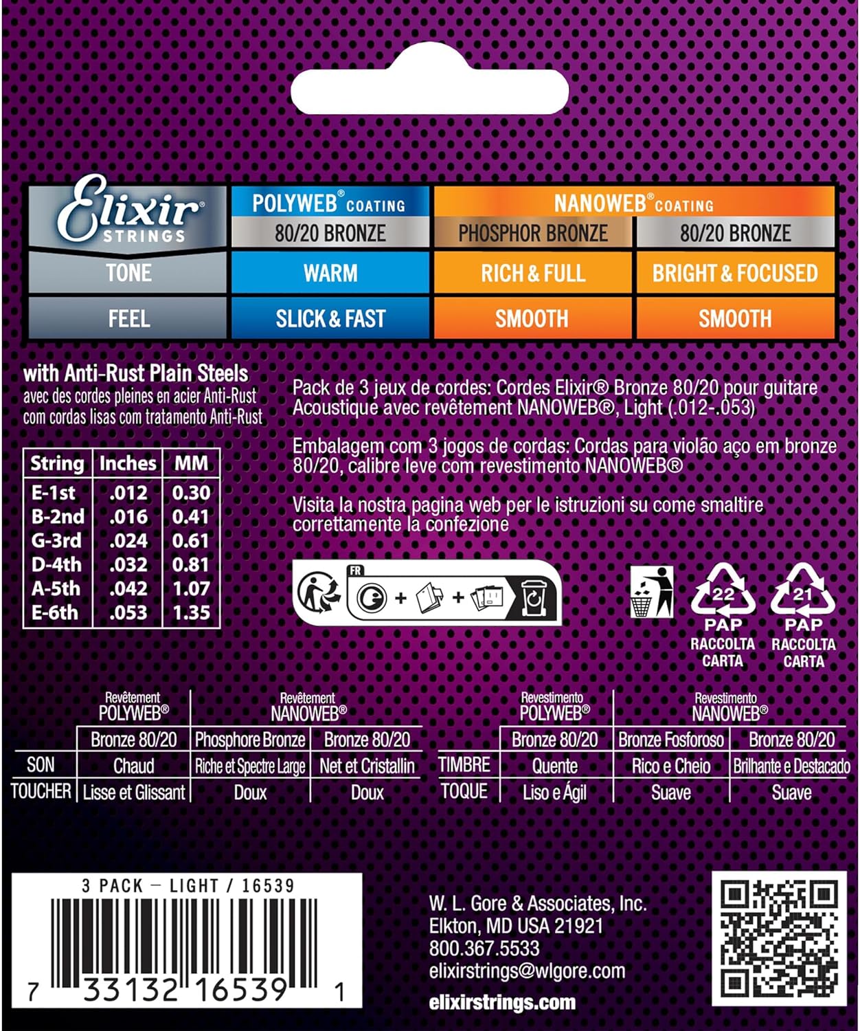 CONTENIDO: Paquete de 3 Cuerdas de Guitarra Acústica Elixir, Bronce 80/20 con Recubrimiento NANOWEB, Tono Brillante y Enfocado de Longitud Máxima con Sensación Cómoda, Juego de 6 Cuerdas, Tono Claro 12-16-24-32-42-53