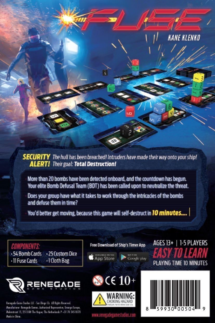 FUSE es un juego de dados cooperativo en tiempo real para 2-5 jugadores donde los amigos trabajan juntos para salvar rápidamente su nave del inminente desastre. ¡Los intrusos han entrado en su nave! Su objetivo: Destrucción Total. Se han detectado veinte bombas a bordo y ha comenzado la cuenta regresiva. Su equipo de Desactivación de Bombas de Elite (BDT) ha sido llamado para neutralizar la amenaza. ¿Tiene su equipo lo que se necesita para trabajar a través de las complejidades de las bombas y desactivarlas todas a tiempo? Será mejor que se muevan, porque este juego se autodestruirá en 10 minutos. "Fuse es un juego cooperativo increíblemente tenso y divertido que puede ser jugado por cualquiera en cualquier momento y que invariablemente toma 10 minutos." - Mina's Fresh Cardboard. "Es divertido, es simple, es fácil, es cooperativo. Marca muchas categorías para mí." - Tom Vasel, The Dice Tower. Un juego de Kane Klenko. Contiene: 25 – Dados Personalizados, 54 – Cartas de Carga, 22 – Cartas FUSE, 1 Bolsa Grande de Tela para Dados con logo FUSE bordado, 1 Libro de Reglas, Descarga GRATUITA de la aplicación Ship's Computer Timer.