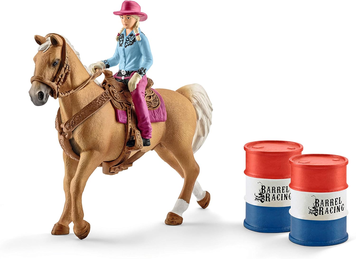 Schleich Farm World 2-Barrel Rodeo Racing Playset - Conjunto de juguetes de carreras de rodeo con vaquera y caballo, Juguetes de animales de granja y accesorios de rodeo occidental realista, 6 piezas para niños y niñas