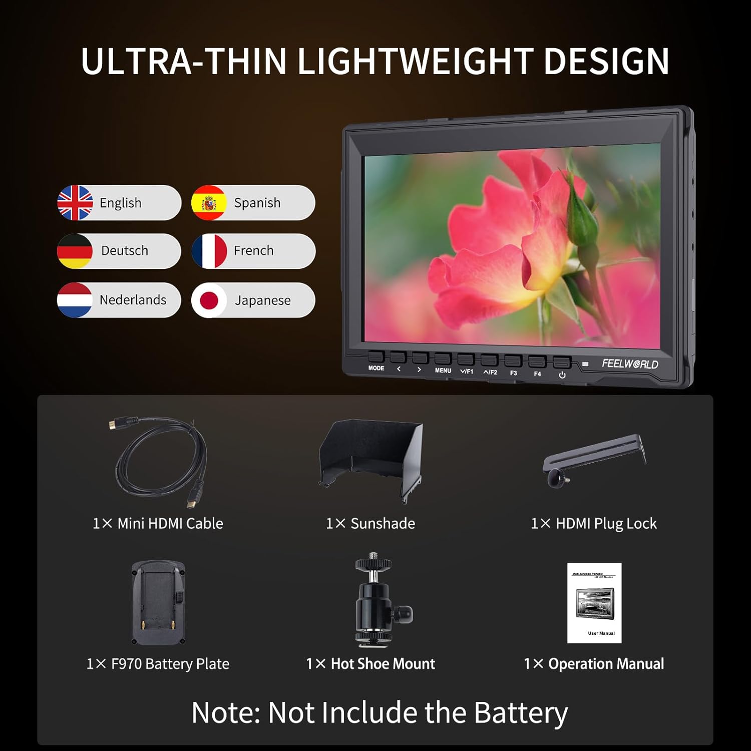 【Contenido del paquete】1× Monitor FEELWORLD FW759, 1× Cable Mini HDMI, 1× Protector solar, 1× Montaje de zapata caliente, 1× Placa de batería F970, 1× Cerradura de enchufe HDMI, 1× Manual de operación. Nota: la batería y el cable de alimentación no están incluidos, para comprar combinaciones de baterías compatibles con nuestro producto, busque FEELWORLD FW759 con batería