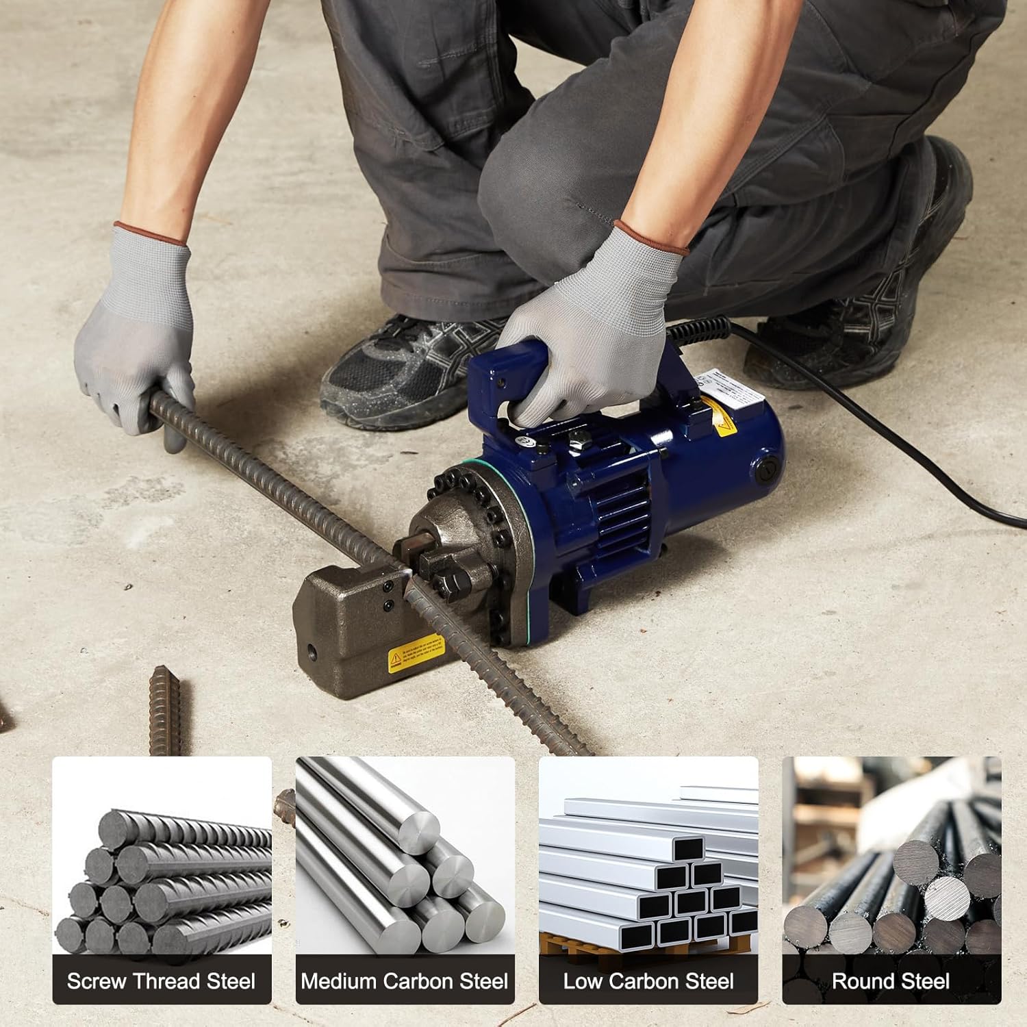 Velocidad de Corte Super Rápida: El cortador hidráulico eléctrico de barra de armadura corta la barra de armadura en 3.5-4.5 segundos sin chispas y sin ruidos. La capacidad de corte varía desde 3/20" (4 mm) #3 hasta 7/8" (22 mm) #7 Grado 60. Satisface sus diversas demandas de corte. Tipos de barras de armadura a cortar: barra de armadura de carbono medio, barra de armadura de bajo carbono, barra de armadura redonda, acero de rosca, etc.