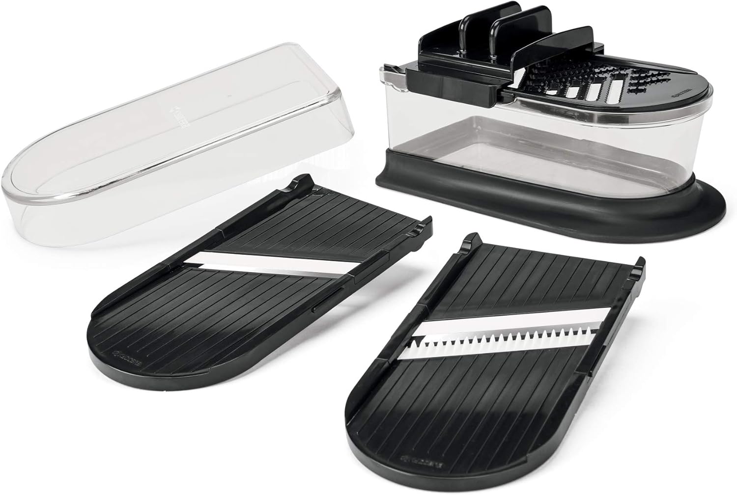 El conjunto incluye: Cortador Mandoline con Cuchilla de Cerámica de Zirconia; Cortador Julienne con Cuchilla de Cerámica de Zirconia; Rallador; Envase de Almacenamiento y Protector de Mano de Seguridad.