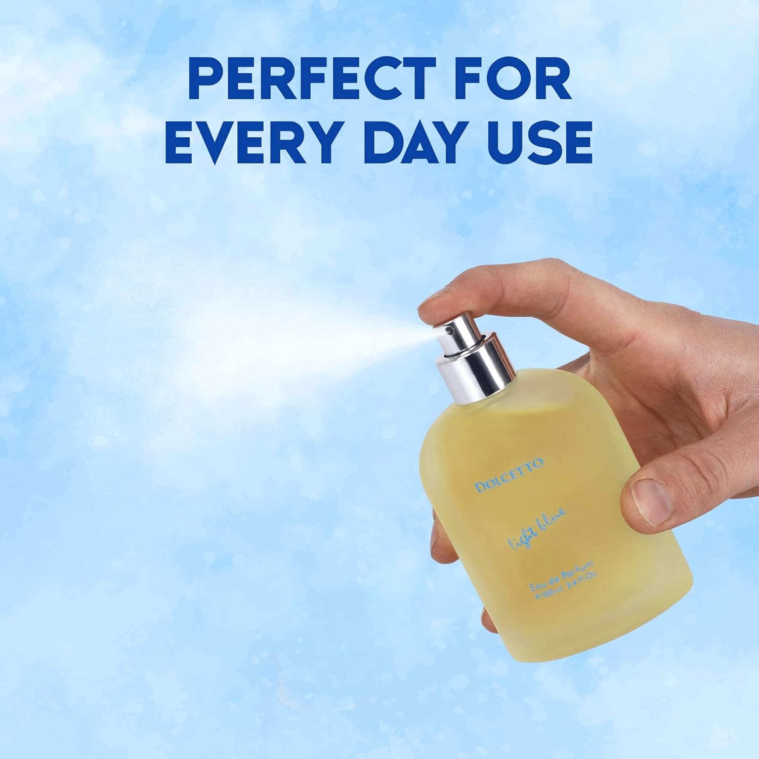 Dolcetto Light Blue para hombre, 3.4 fl. Perfume masculino de 100 ml con bolsa de transporte NovoGlow, refrescante combinación de fragancia amaderada, floral y acuática, aroma que dura todo el día, un regalo para cualquier ocasión
