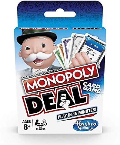 El Juego de Cartas Monopoly Deal es toda la diversión del juego de mesa Monopoly en un juego de cartas de rápida distribución. Viene con 110 cartas, incluyendo Cartas de Propiedad, Cartas de Propiedad Salvajes, Cartas de Acción, Cartas de Alquiler, Cartas de Casa y Hotel, y Cartas de Dinero. Las Cartas de Propiedad Salvajes ayudan a los jugadores a construir conjuntos de Propiedades. Las Cartas de Acción permiten a los jugadores hacer cosas como cobrar alquileres y hacer tratos complicados. Las Cartas de Casa y Hotel aumentan los valores de alquiler. Y los jugadores pagan sus deudas con Cartas de Dinero. Sé el primer jugador en recoger 3 conjuntos completos de Cartas de Propiedad en diferentes colores para ganar. ¡Este juego de cartas para mayores de 8 años es una gran manera de jugar el Juego de Comercio de Propiedades Rápido en tan solo 15 minutos! Fácil de jugar y configurar, ¡es un juego agradable para vacaciones, viajes por carretera y noches de juego en familia! Los nombres y logotipos de Hasbro Gaming, Parker Brothers y Monopoly, el diseño distintivo del tablero de juego, los cuatro cuadrados de las esquinas, el nombre y personaje del Sr. Monopoly, así como cada uno de los elementos distintivos del tablero y piezas de juego son marcas comerciales de Hasbro para su juego de comercio de propiedades y equipo de juego.