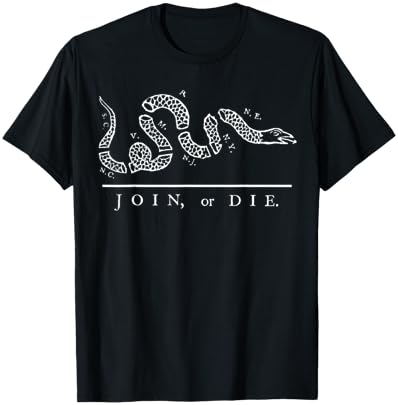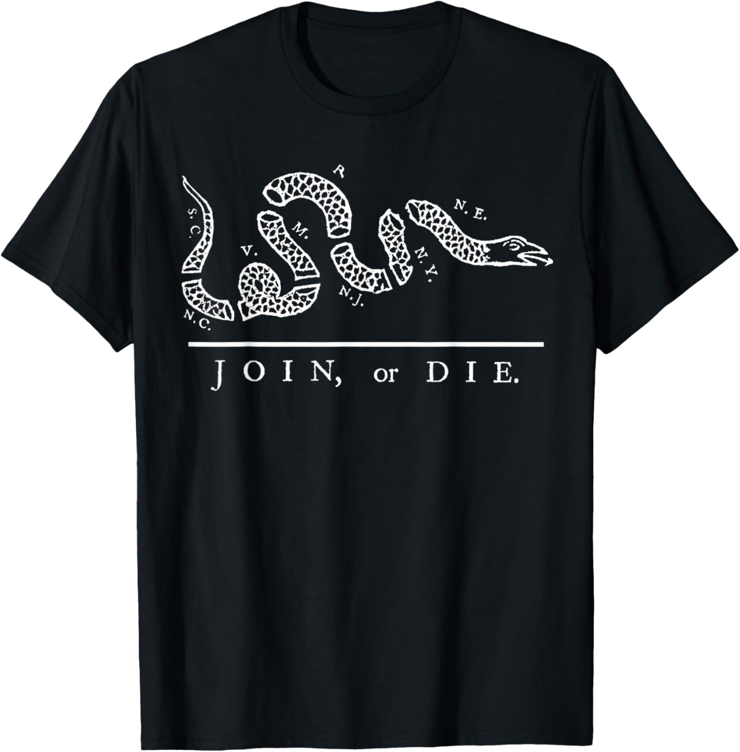 Camiseta de la era colonial con el lema "Join or Die" de Benjamin Franklin 1754 revolución