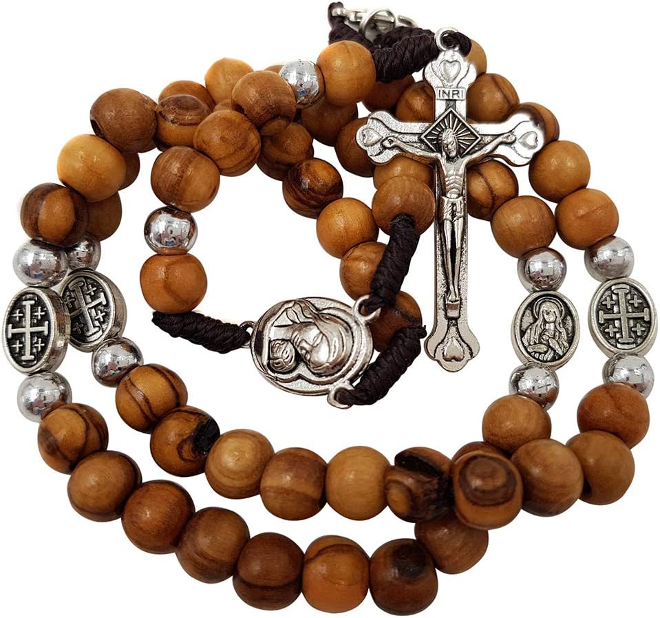 Rosario católico de cordón de cuentas de madera de olivo con tierra santa de Jerusalén y certificado en estuche de terciopelo azul. Este rosario artesanal es de excelente calidad con cuentas redondas de madera de olivo real de 5 mm, crucifijo católico de tono plateado con la palabra "Jerusalén" grabada convexamente en el reverso, pieza central (un lado - icono de la Virgen María, otro lado - Tierra Santa de Jerusalén con las palabras "Terra Jerusalem") y medallas con la Virgen María. El crucifijo y los conectores están hechos de zinc y recubiertos de plata, evitando la corrosión. Este rosario está hecho a mano en Belén, Tierra Santa, por artesanos cristianos locales y bendecido en la Iglesia del Santo Sepulcro, Jerusalén. Viene con un estuche de terciopelo para rosario gratis. POR FAVOR TENGA EN CUENTA: El color y las texturas de las cuentas pueden ser ligeramente diferentes, pertenecen a la edad del olivo. *Mide aproximadamente 40 cm / 16 pulgadas.