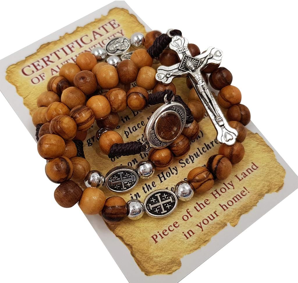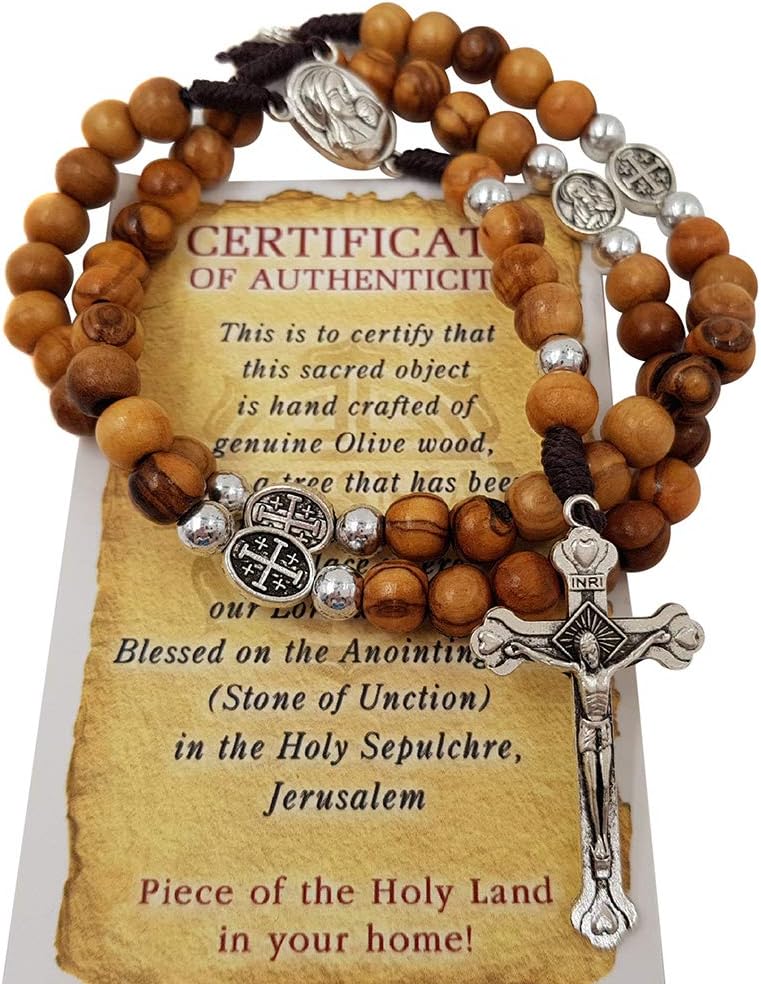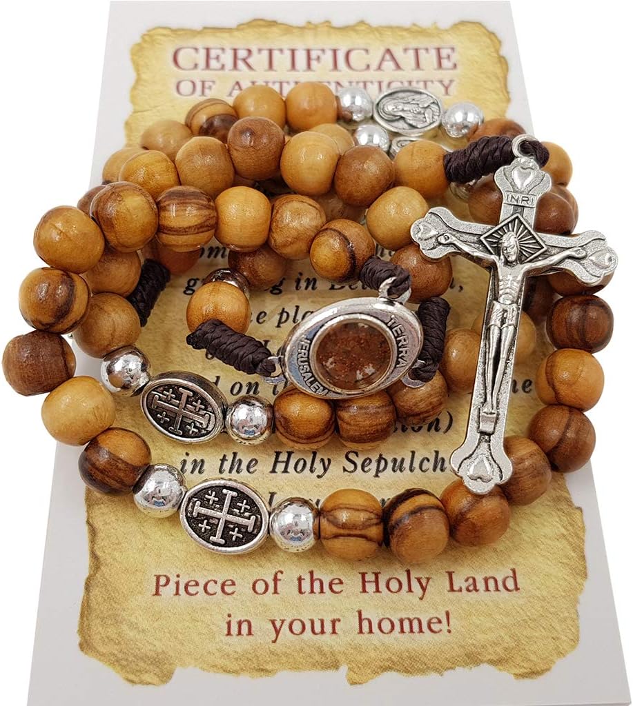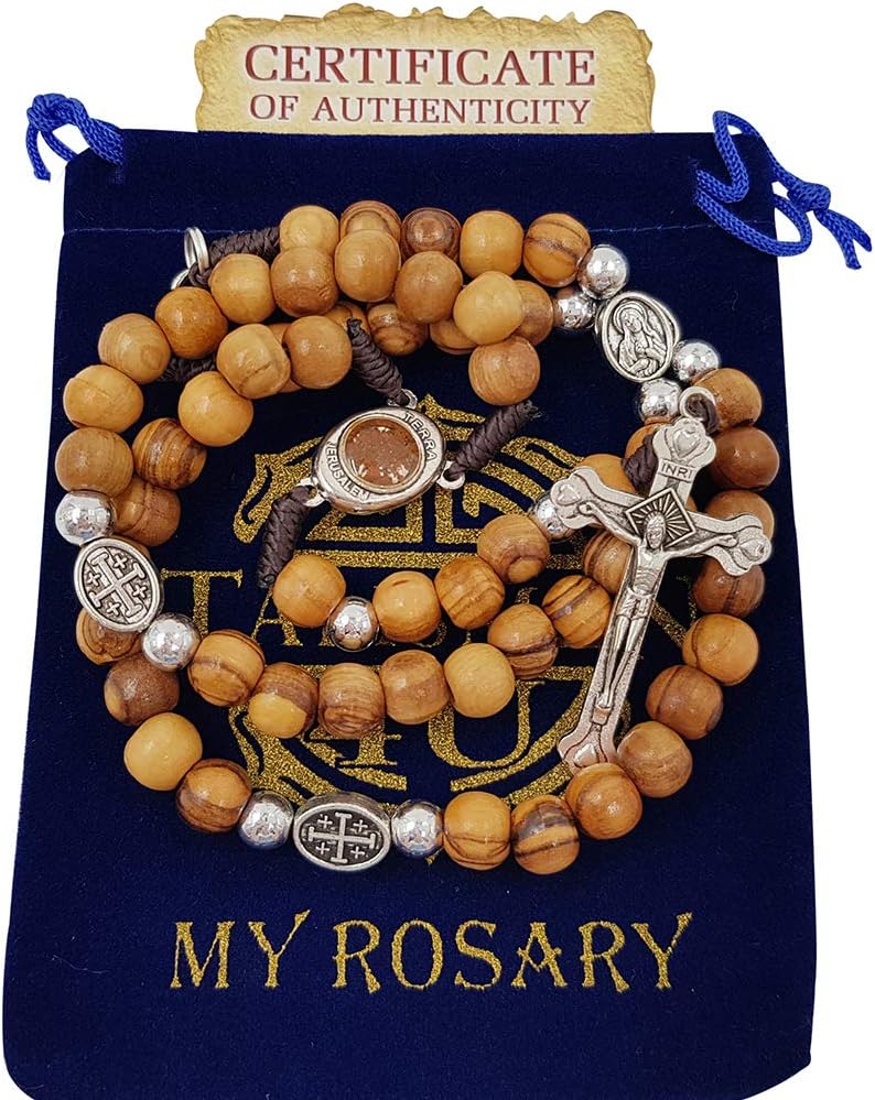 Collar católico de rosario de madera de olivo TALISMAN4U con certificado y tierra santa de Jerusalén en estuche de terciopelo azul