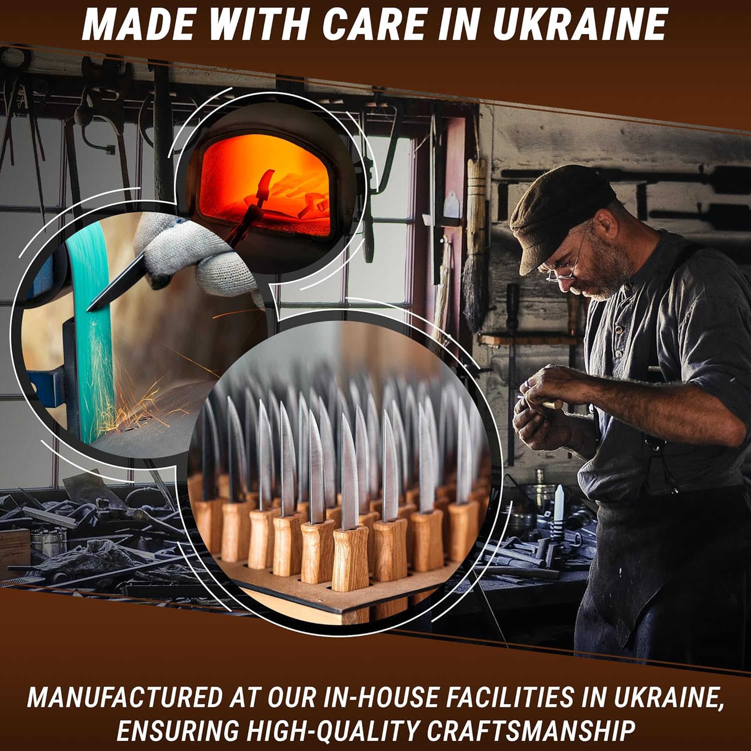 Origen del Kit de Cizalla para Tallado de Cucharas: Estas herramientas para hacer cucharas—cizalla de taza, cuchillo kuksa, cizalla de cuchara—son hechas a mano en Ucrania, Europa, y su excelente calidad asegura que durarán años de uso confiable.
