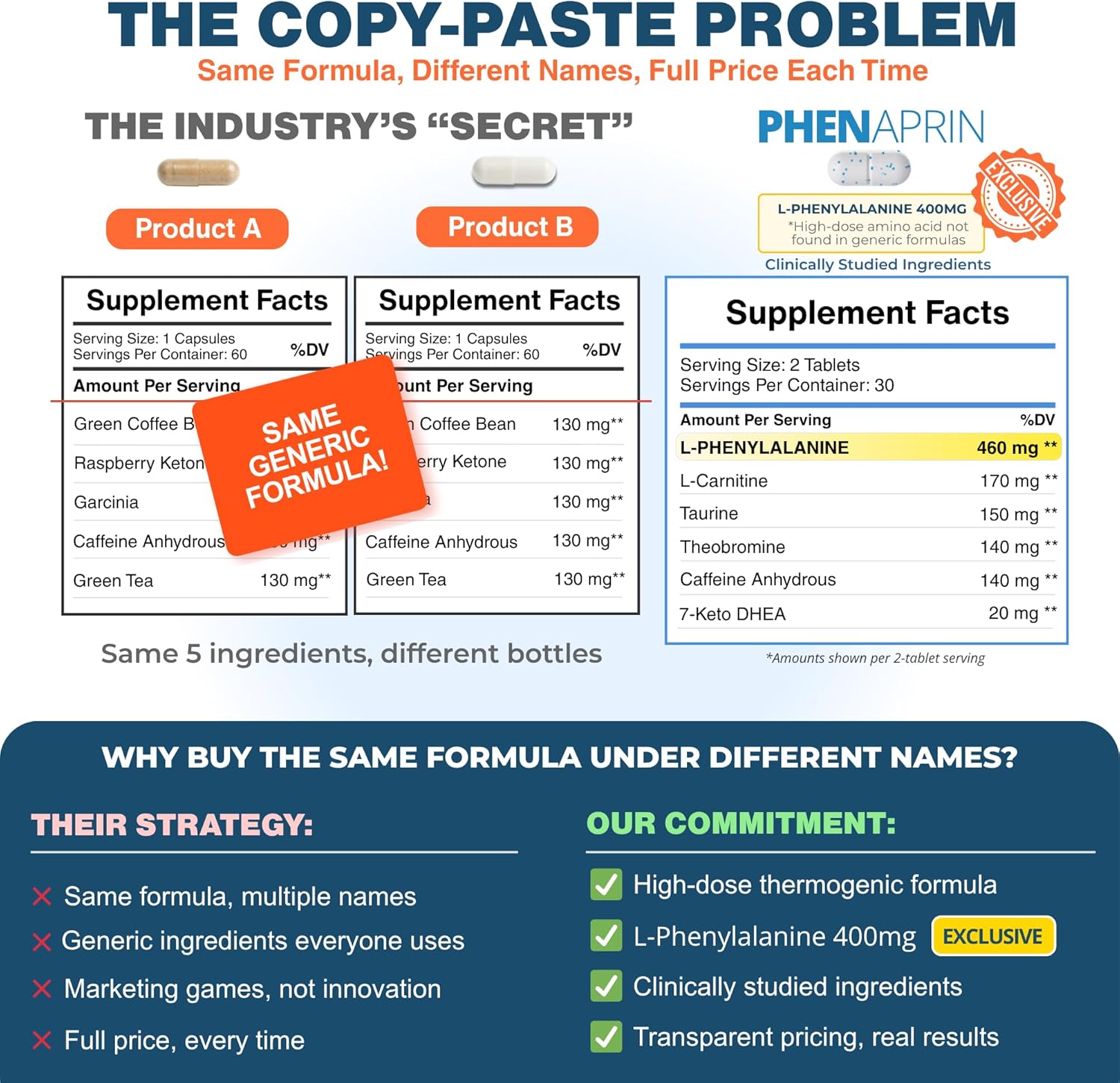 POR QUÉ PHENAPRIN SE DIFERENCIA DE LAS TÍPICAS PASTILLAS DE DIETA PARA LA GESTIÓN DE PESOCuando se trata de gestionar tu peso de manera efectiva, PhenAprin se diferencia con su tecnología de tableta de liberación extendida única y los ingredientes cuidadosamente seleccionados que trabajan juntos para apoyar tus objetivos.LA CIENCIA DETRÁS DEL CONTROL EFICAZ DEL APPETITELa mezcla patentada de 530 mg de PhenAprin incluye:- L-fenilalanina (230 mg): Apoya las señales naturales de saciedad para el control de porciones- L-carnitina (85 mg): Ayuda a transportar los ácidos grasos para quemarlos como energía- Taurina (75 mg): Promueve la salud metabólica y la producción constante de energía- Teobromina (70 mg): Proporciona energía suave y sostenida sin la dureza de la cafeína- Cafeína anhidrada (70 mg): Aproximadamente menos de una taza de café—equilibrada para el enfoque sin nerviosismo- 7-Keto DHEA (10 mg): Ayuda a mantener un metabolismo saludableCÓMO PHENAPRIN APOYA TU VIAJE DE GESTIÓN DE PESOPhenAprin está diseñado para apoyar tres beneficios distintos cuando se incorpora en tu rutina diaria:EXPERIENCIA INICIAL (Fase 1): Reducción notable de los antojos entre comidas y mejor control de porcionesESTABLECIMIENTO DE PATRONES (Fase 2): Patrones de alimentación más saludables y mayor energía para la actividad físicaCONTINUACIÓN DEL APOYO (Fase 3): Regulación sostenida del apetito y asistencia termogénica continuaCOMPAÑERO PERFECTO PARA TU ENFOQUE PREFERIDOYa sea que estés siguiendo el ayuno intermitente, una dieta baja en carbohidratos o utilizando programas inspirados en GLP-1, PhenAprin es ideal para:- Aquellos que buscan ayuda con el hambre y los antojos que desafían los objetivos nutricionales- Personas que experimentan estancamientos que desean asistencia adicional- Individuos que necesitan apoyo para áreas problemáticas mientras mantienen el tono muscular- Aquellos que buscan energía limpia y sostenida sin estimulantes pesados- Cualquiera que busque apoyo integral para su viaje de bienestarEL COMPROMISO DE CALIDAD DE PHENAPRINCada lote se somete a rigurosos tests de laboratorio de terceros para verificar pureza y potencia. Estamos detrás de nuestra fórmula con un compromiso de calidad, porque creemos en proporcionar productos premium en los que puedes confiar.¡Únete a la comunidad PhenAprin que ha incorporado nuestra fórmula en un enfoque integral de bienestar. ¡Ordena el tuyo hoy!