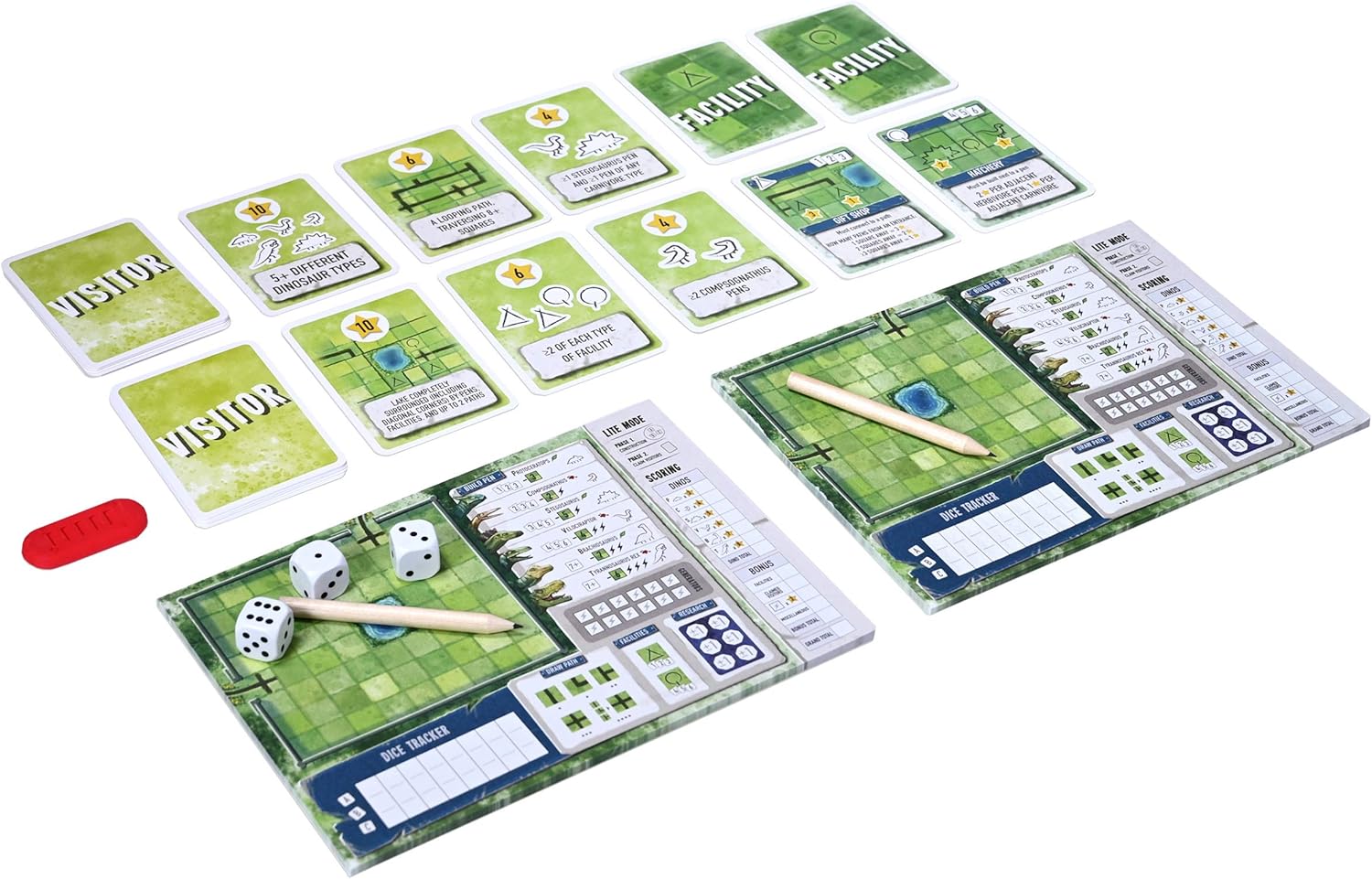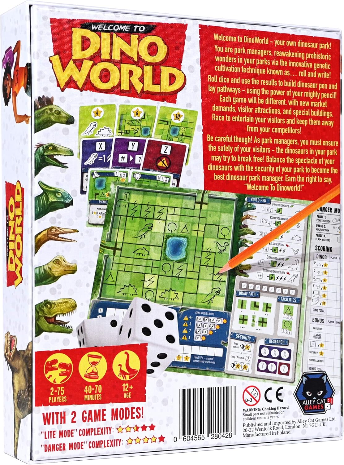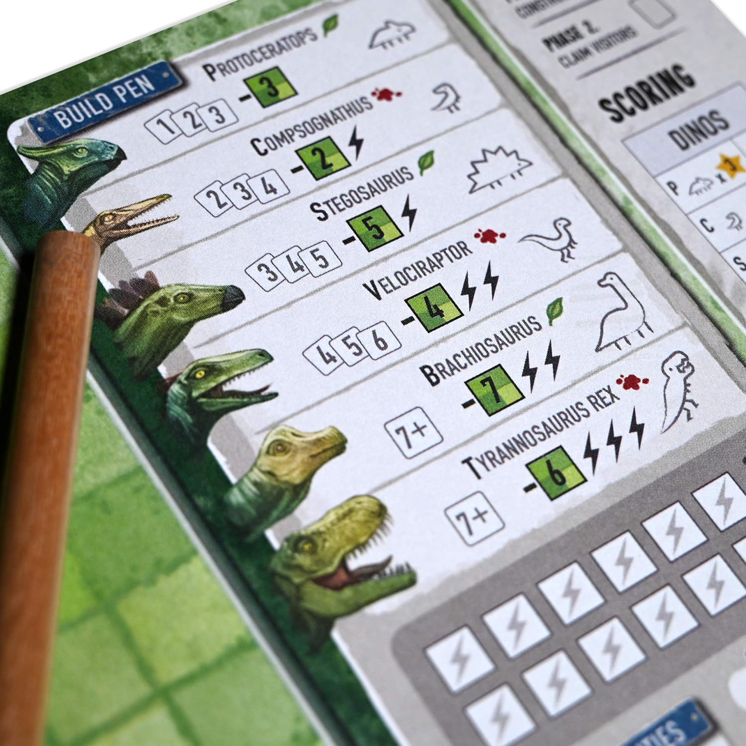 Construye y gestiona tu propio parque de dinosaurios en este juego estratégico de lanzamiento y escritura para 2 o más jugadores.