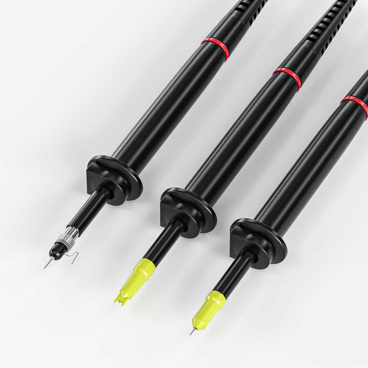 La punta del gancho removible está protegida por una carcasa de plástico. La manga de posicionamiento asegura la estabilidad y fiabilidad de la punta expuesta en el punto de prueba. Anillos de identificación de 4 colores compatibles con la mayoría de las tamaños de sondas de osciloscopio para una fácil diferenciación de canales.