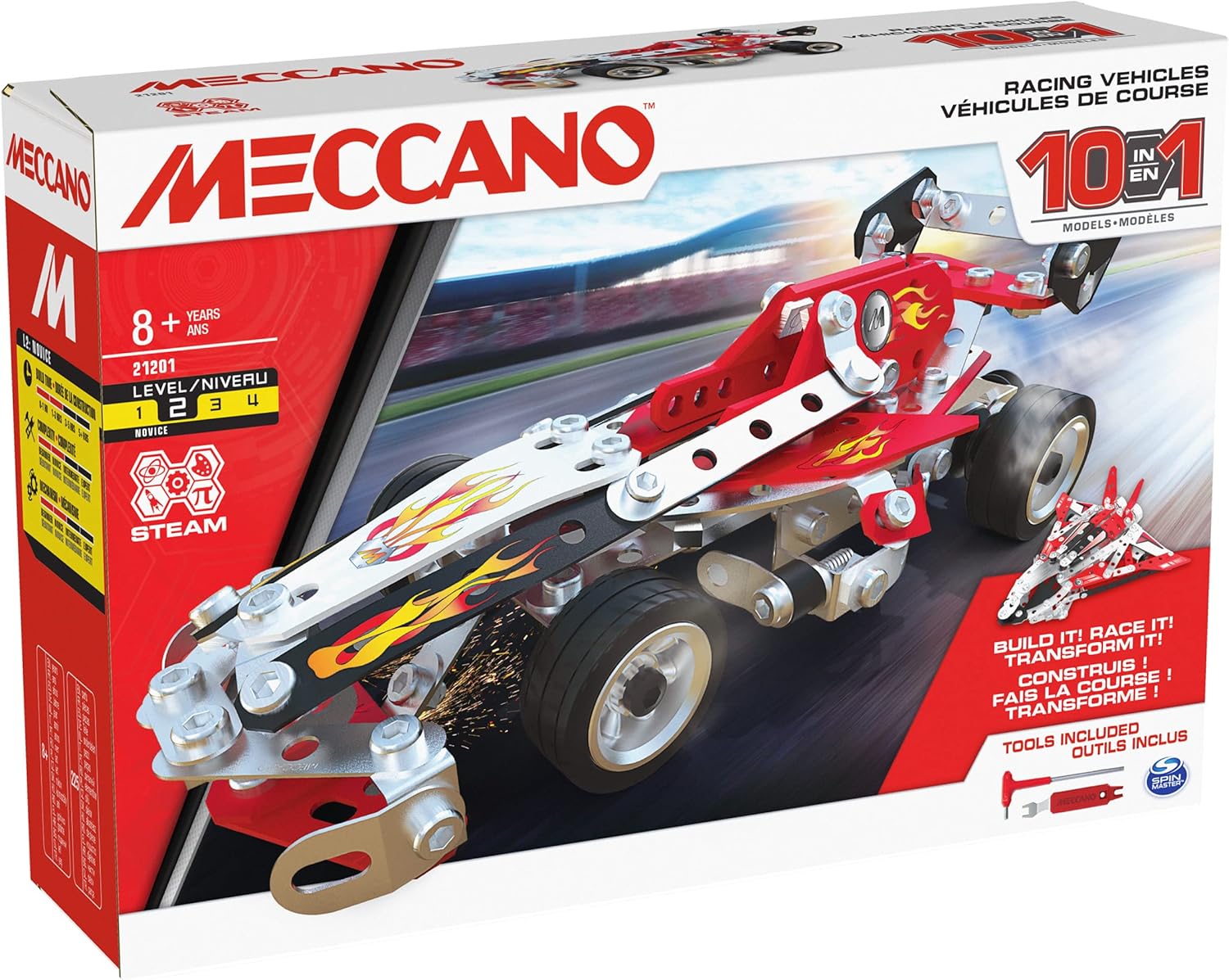 REGALO DE CUMPLEAÑOS, FESTIVO O NAVIDEÑO PARA NIÑOS: El Set de Vehículos de Carreras 10 en 1 de Meccano es para niños a partir de 8 años. Excelentes juguetes para niños y niñas. Encuentra instrucciones adicionales de construcción en Meccano.com. Construye, corre y transforma