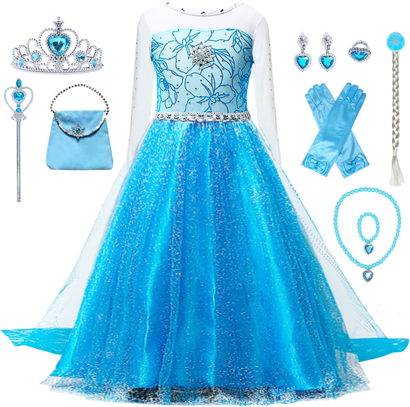 ~ Vestido de Princesa de Lujo, Cosplay de Reina de las Nieves para Fiesta de Cumpleaños, Navidad, Disfraz de Halloween para Niñas, Regalo de Fiestas, 3-8 Años~ Característica: 1.Completo con bonita corona, varita, collar, anillo, pendientes, trenza y guantes. 2. El lujoso vestido de princesa de nieve permitirá que tu pequeña princesa entre de inmediato en el Mundo de las Hadas. 3. El diseño más nuevo con cinturón de encaje plateado es mejor para cada princesa de la nieve de 3 a 8 años. 4. Crea momentos preciosos y dulces que solo pertenecen a ti y a ella al abrir este elegante vestido como regalo de fiesta 5. Ese vestido azul de princesa es perfecto para fiestas de cumpleaños, disfraces de Cosplay, Halloween, Navidad, Juguetes de Simulación, Juegos de Roles Información de tallas: *Talla 110: Adecuado para edades de 3-4 años; Altura sugerida: 100cm/39.37 pulgadas; Longitud del vestido: 78cm/30.70 pulgadas; Cintura del vestido: 58cm/22.83 pulgadas *Talla 120: Adecuado para edades de 4-5 años; Altura sugerida: 110cm/43.30 pulgadas; Longitud del vestido: 81cm/31.88 pulgadas; Cintura del vestido: 62cm/24.40 pulgadas *Talla 130: Adecuado para edades de 5-6 años; Altura sugerida: 120cm/47.24 pulgadas; Longitud del vestido: 86cm/33.85 pulgadas; Cintura del vestido: 64cm/25.19 pulgadas *Talla 140: Adecuado para edades de 6-7 años; Altura sugerida: 130cm/51.18 pulgadas; Longitud del vestido: 90cm/35.43 pulgadas; Cintura del vestido: 66cm/25.98 pulgadas *Talla 150: Adecuado para edades de 7-8 años; Altura sugerida: 140cm/55.11 pulgadas; Longitud del vestido: 93cm/36.61 pulgadas; Cintura del vestido: 70cm/27.55 pulgadas Consejos útiles: 1. No planchar. El planchado húmedo puede causar daños irreversibles. 2. Se debe aceptar una ligera diferencia de color debido a la luz y la pantalla. 3. Hay una diferencia del 2-3% según la medición manual, por favor revise la tabla de tallas cuidadosamente antes de comprar.