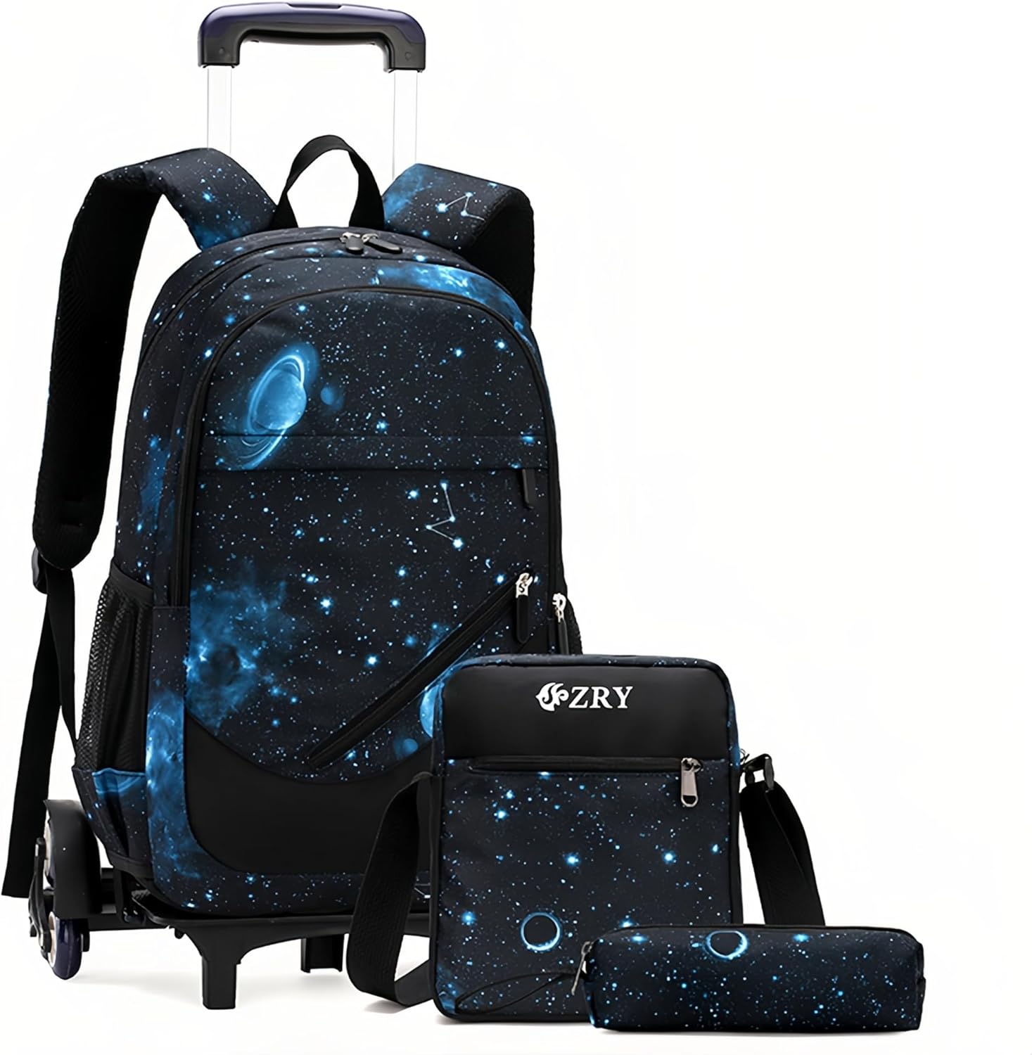 3Pcs Mochila Rodante Negra Galaxy para Escuela Primaria, Juego de Mochilas con Ruedas para Niños de Primaria con Seis Ruedas