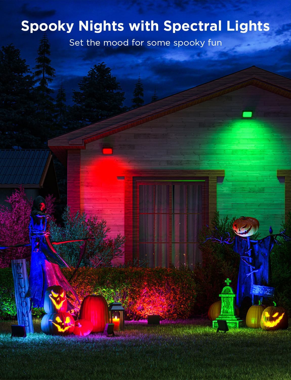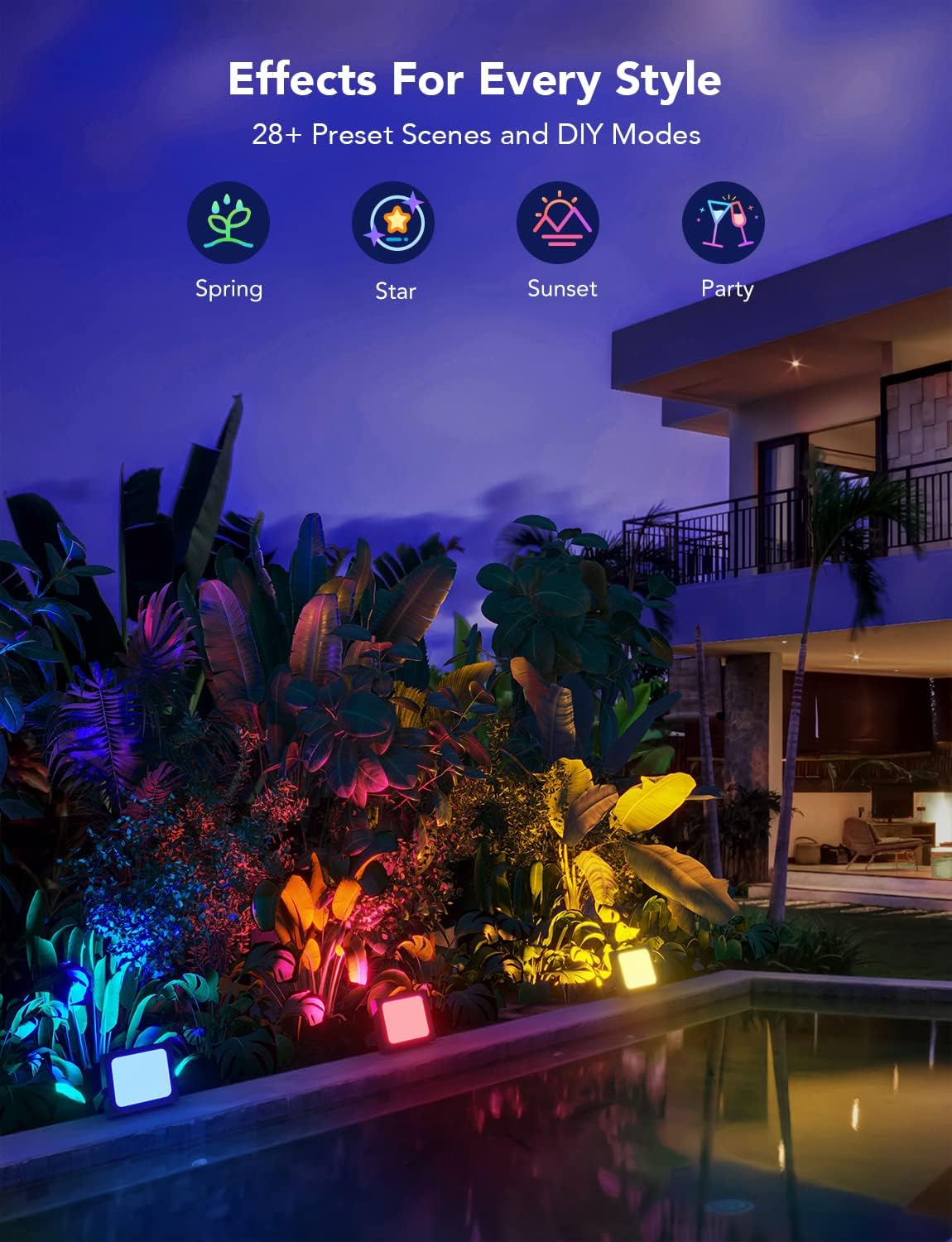 Efectos de luces de inundación al aire libre: Ilumine cualquier fiesta al aire libre con estas luces de inundación animadas RGBIC. Los efectos de luz pueden sincronizarse con la música de fiesta y festival con el micrófono en su teléfono. Diseñe sus propias decoraciones, iluminación y fiestas al aire libre de la casa.
