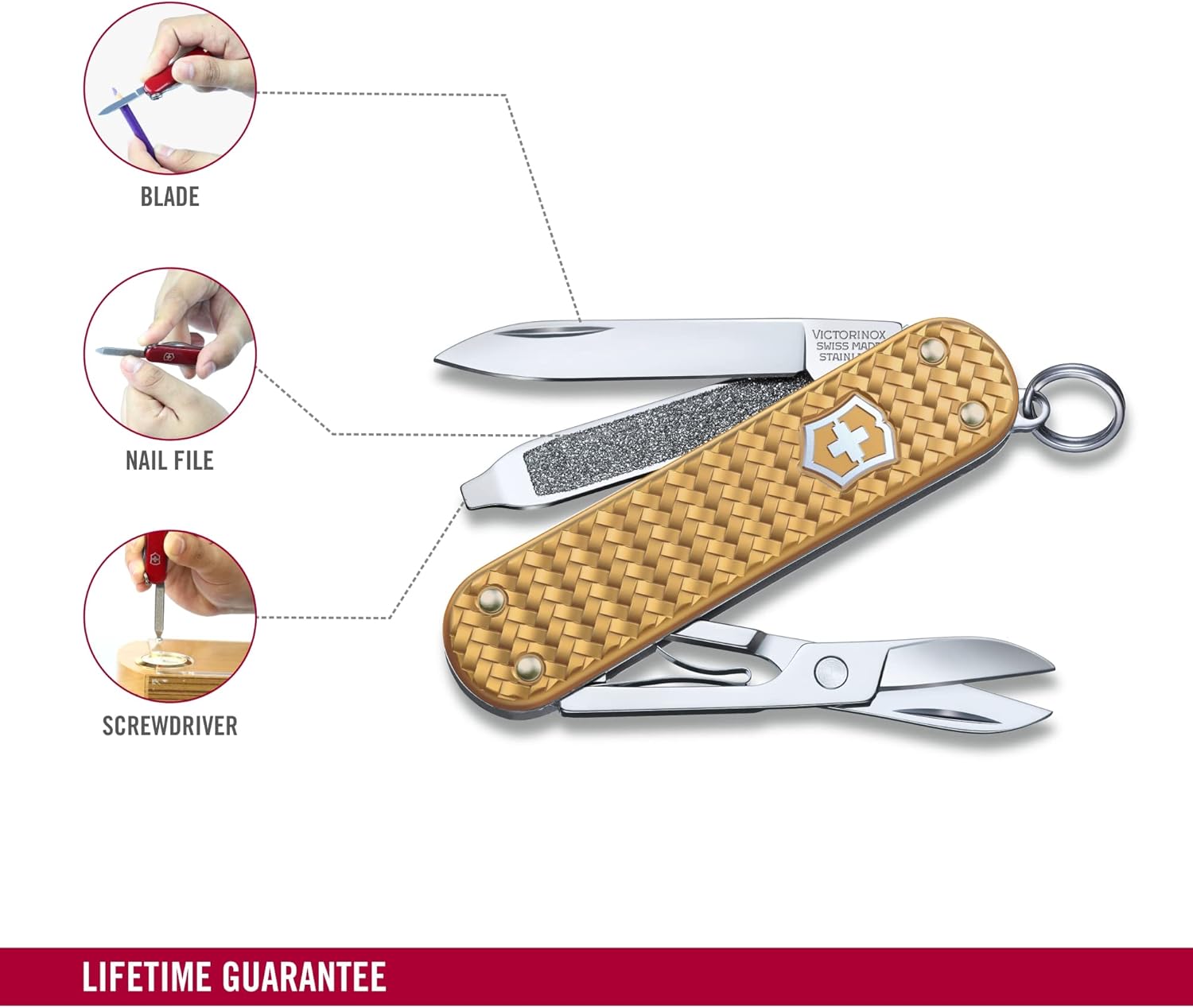 Victorinox Classic SD Precious Alox Navaja Suiza del Ejército, Navaja de Bolsillo Compacta de 5 Funciones Hecha en Suiza con Puñal Pequeño, Destornillador y Llavero - Oro Latón