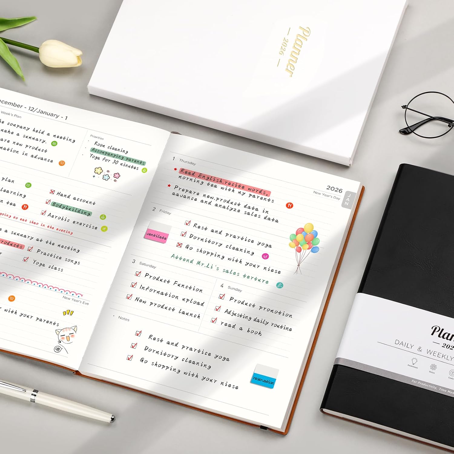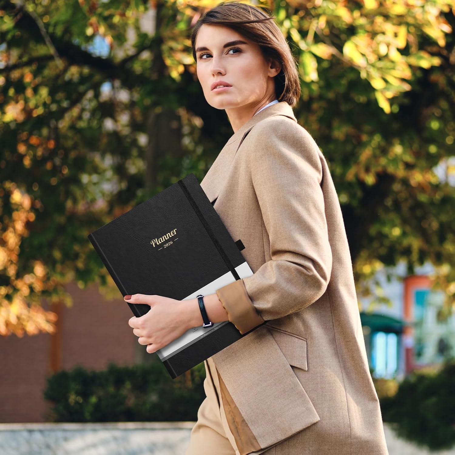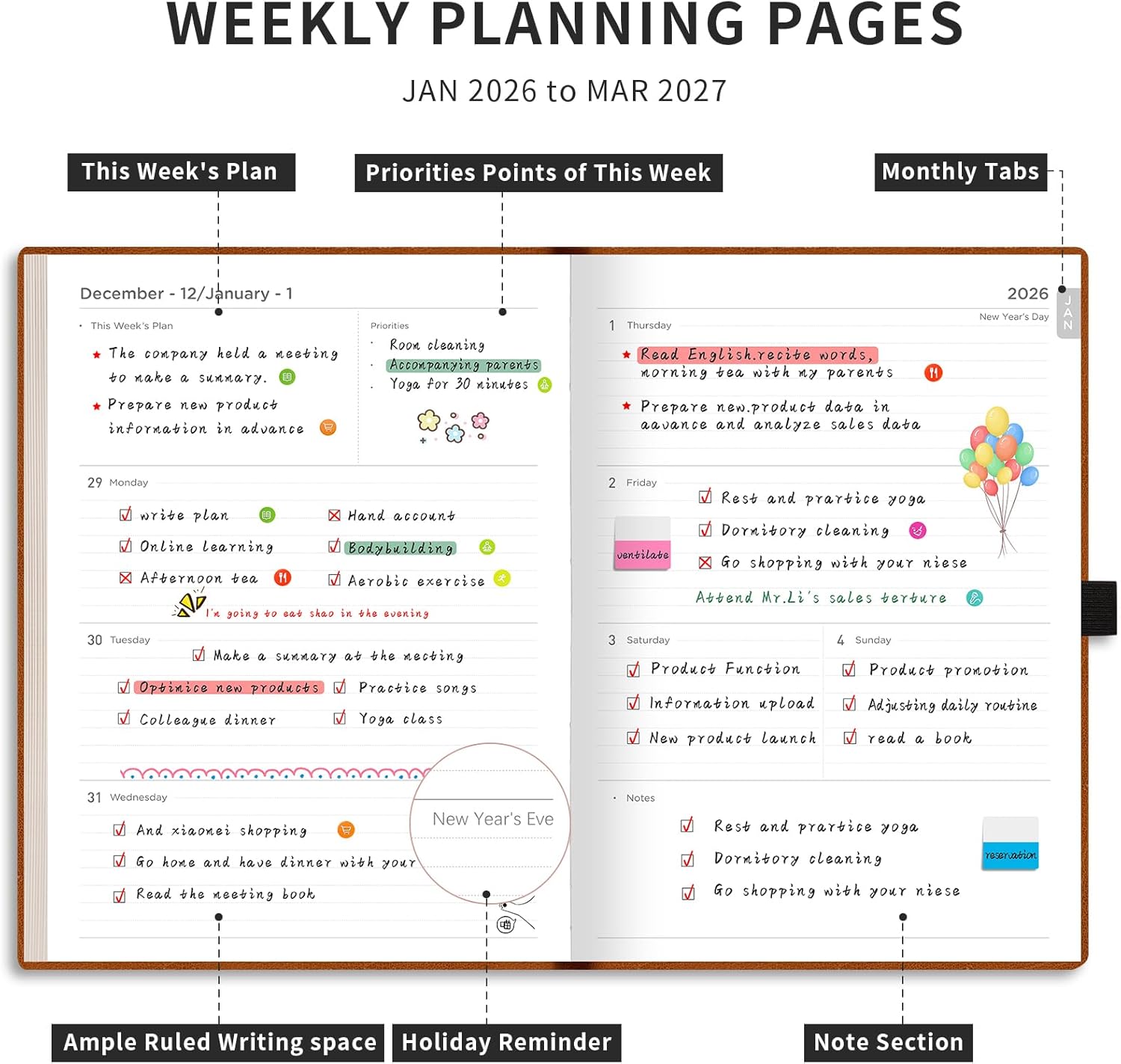 DISEÑO PROFESIONAL: Planificador 2026-2027 para tomar el control de tu agenda con elegancia atemporal. Elaborado con una cubierta suave de cuero sintético de primera calidad, encuadernación ajustada y papel de 100gsm de grosor, garantiza durabilidad para un uso prolongado. Además, cuenta con un bolsillo interior para almacenar convenientemente artículos diversos, manteniendo todos los elementos esenciales al alcance