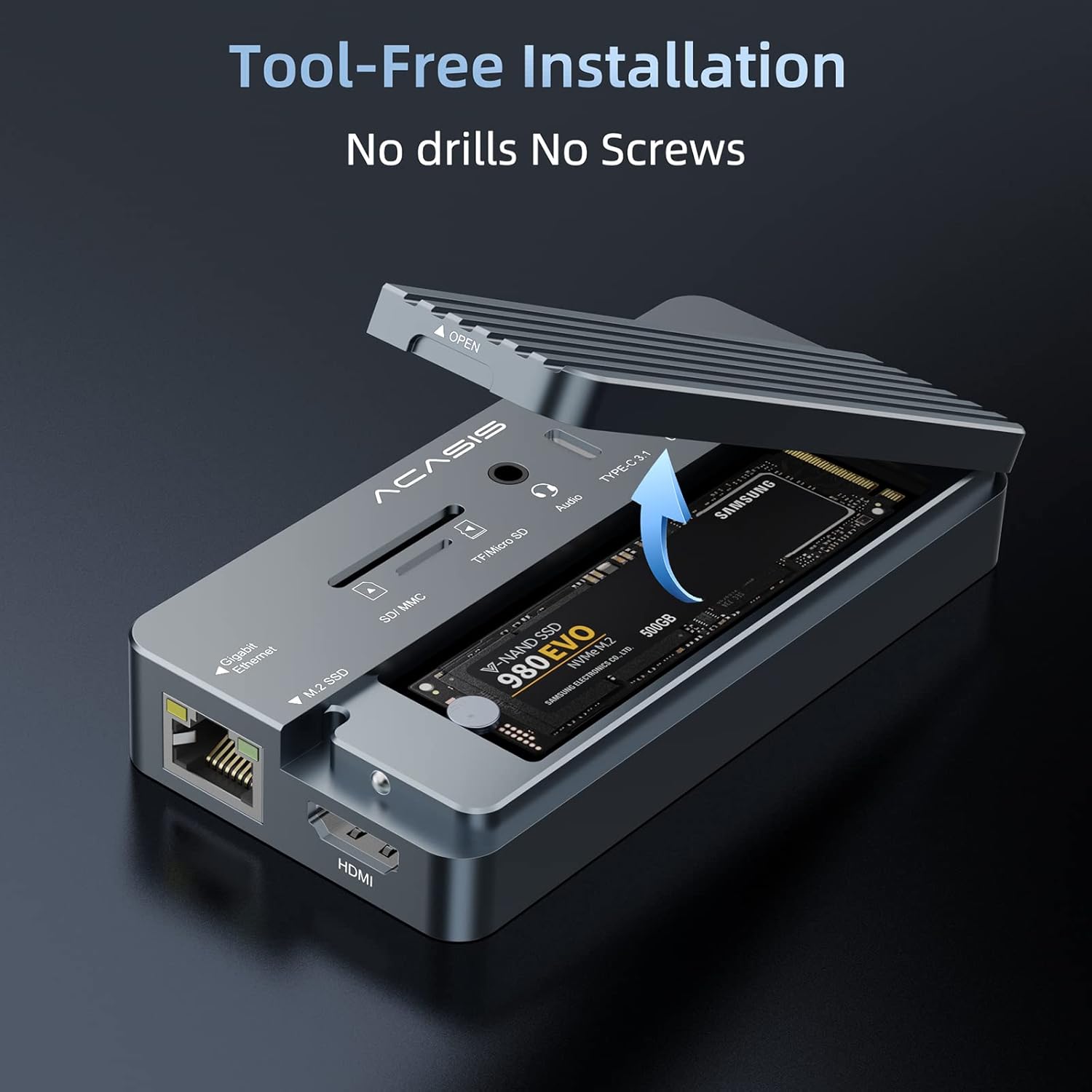 Estación de acoplamiento USB C ACASIS con carcasa SSD M.2 NVME: No solo el hub ACASIS 10-en-1 proporciona más conexiones para periféricos, sino que también puedes insertar fácilmente una unidad SSD M.2. Funciona con Windows, Mac OS, Linux, Chromebook OS.